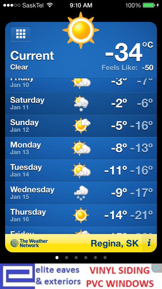 I'm 3 1/2 hours east of Regina. At the moment -31 C (with the wind feels like -48) or -24F (with the wind feels like -54F)