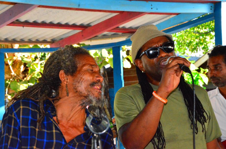 I really think it is Frank and some other musicians/singers. And, Frank does not play the sax. He plays the trumpet. I think I must have had Dean Frazier and sax playing on my mind, because I am really loving listening to Dean play sax on the new Tarrus Riley, Love Situation album. I'm sure there's got to be someone who has been by the Boat Bar who may know.