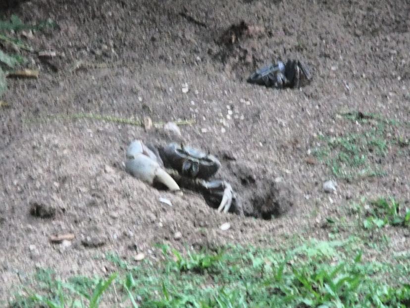 This is the first land crab I've seen in the yard this year. This guy had a huge claw and I watched as he ate with the smaller one. But they have been around. I was told yesterday that they raid the garden and have eaten the young allo plants. This was the closest I could get before he ran back to his burrow.