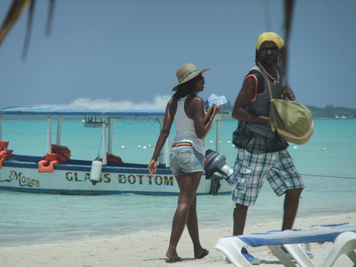 Two vendors, he sells neckerchiefs and she has tickets for something.