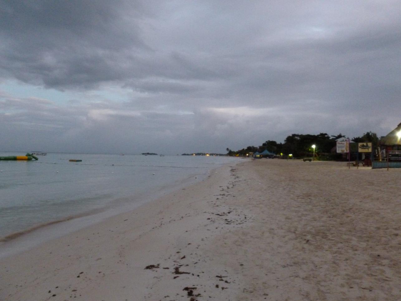 just at sunrise with the lights of the resorts glittering along the beach.