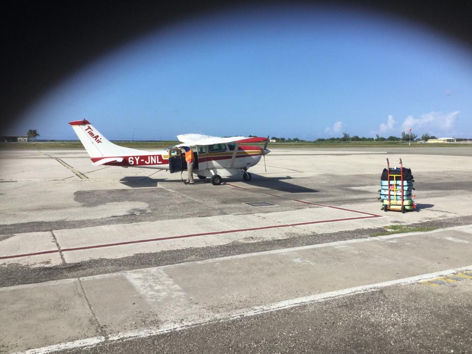 Tim air... Their service is incredibly friendly, the pilots are awesome. I am not sure this is really worth it though. Mainly because it is super pricey. $320 one way for my wife and I. I had to have a charter because of the insane amount of luggage we had (the raft), but $320 for a 15 minute trip just seems exorbitant. I may not do that again... Not sure. The other thing is, the plane is definitely the same one we used when we came down the first time 16 years ago. That plane was old then. They have repainted them, but the inside panels and the like are coming apart. Plus, it just scares the hell out of me. We flew in just as a storm was hitting the west end, and let me tell you... That is some scary stuff to see from that height.