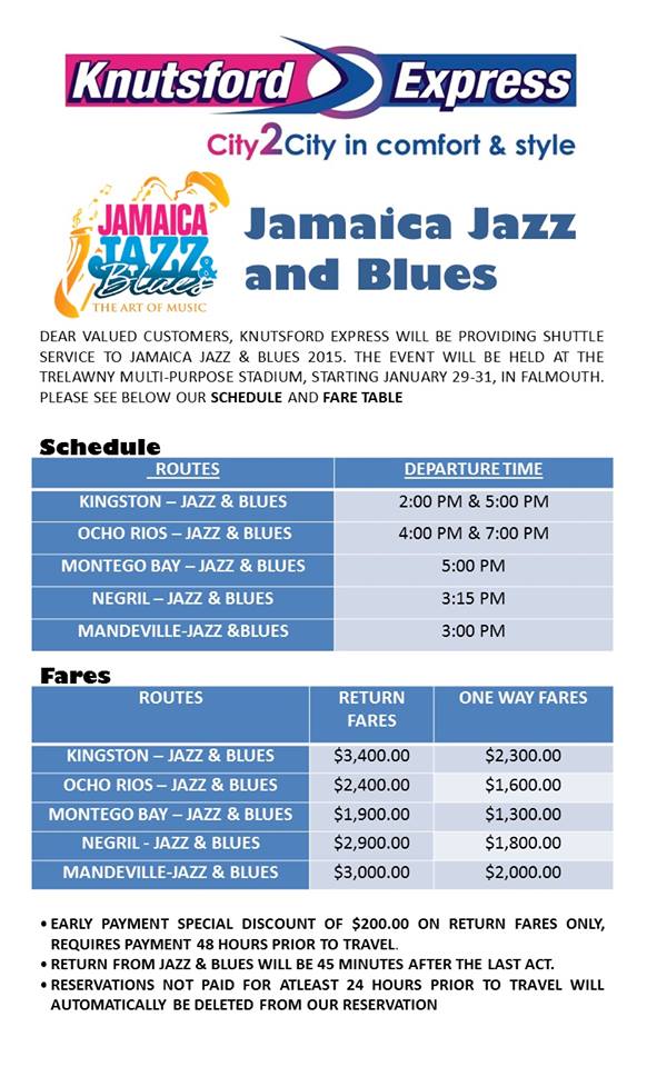 knutsford Express will be offering service to Jamaica Jazz and Blues 2015.Departing from our Negril station to the festival daily at 3:15 pm to return from the venue 45 minutes after the last act.