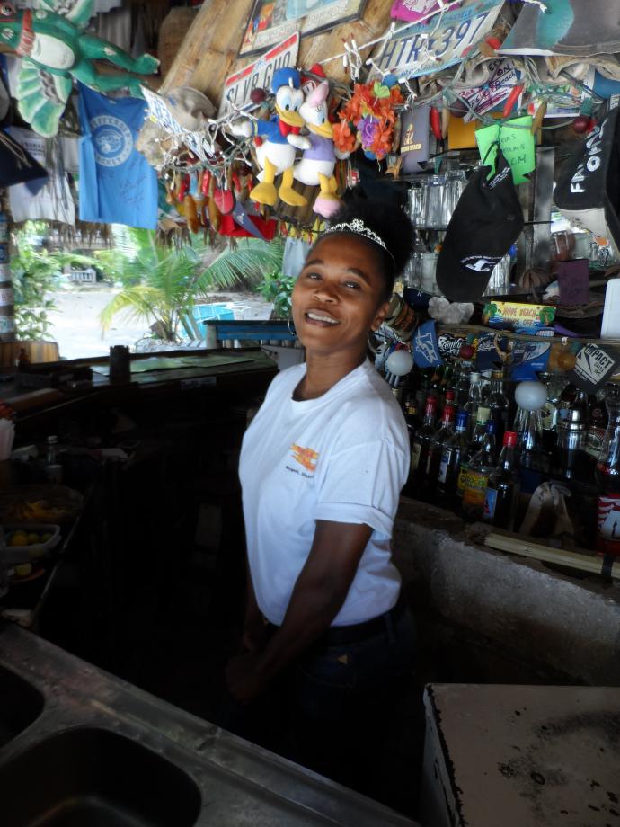 Our first trip on Southwest (Midway/Chicago) went off without a hitch. We took the advise of a friend to buy the early bird package, and glad we did. We had spot A27 &28. The fifth row was great. So glad that we found Club Mobay at Sangster a few years back. I bet we walked past at least 500 people going to immigration. Talked to several line standers later in the week and they spent almost 3 hours in line that day. Note to self, never travel on a Saturday with an arrival time afternoon. Thanks to Club Mobay, we were out of there in 25 minutes. We found Patrick Grandison with Esparanza Tours and we were off to Negril with a cooler of Red Stripes. First stop was at the Digicell store on the hip strip but their computers were down. Oh well, off to Negril. Potty stop and a quick stretch halfway was a very good thing. We stayed at the Grand Pineapple (AI) again with this being out 35th night there. Love the place! We used some Pineapple Perks points and we were all in with flight and hotel for about $1800.00 for both of us in an ocean view 2nd floor room. The staff was great as usual. The Digicell store downtown was closed by the time we got to Negril, so the phone calls home would have to wait. Sunday wakeup was to beautiful skies and calm seas. After a quick breakfast it was time to see some old friends on the beach, including the famous Gilbert. Our biggest decision of the morning was to either walk north, or south. Flipped a coin, north it will be. Our first stop would be at Tony's Hut for a reunion with our favorite bartender Grace Ann. We love her and her dirty bananas. Wearing a tiara, she was the princess of the beach, and we were her loyal subjects.