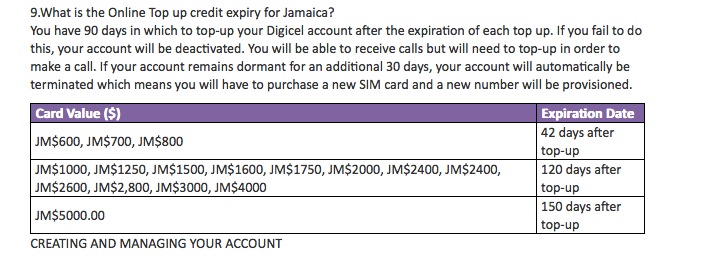 however even with top ups in less than 90 days, if seems as if you have not MADE any calls while on the island in that time, regardless of having credit on your phone and an active sim, you still need to do a top up once you arrive in order to have the phone allow calls. We have seen this on one but not both of our JA phones over the past 18 months and while Digicel staff will tell you same as noted above, we have had the on island top up requirement on 5 of our last 6 trips and some were actually less than 60 days apart - very odd.
