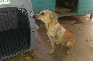 This is a photo of Magic Mike after his surgery. He is being taught to lay in a crate for his airplane travel. We are trying to raise enough money so the two three legged dogs can come to Canada prior to the heat embargo.