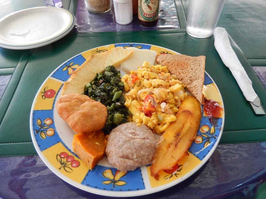 Ackee & salt fish, callaloo, Johnny cake, fried plantains, toast & oatmeal porridge