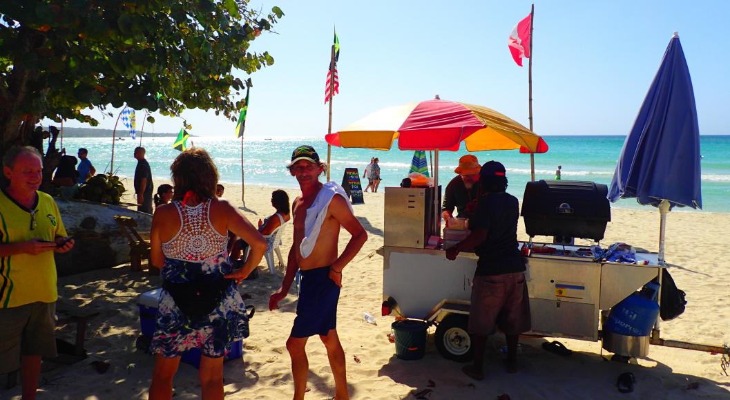 Who has the BBQ cart? Whats he selling? Where is he located?