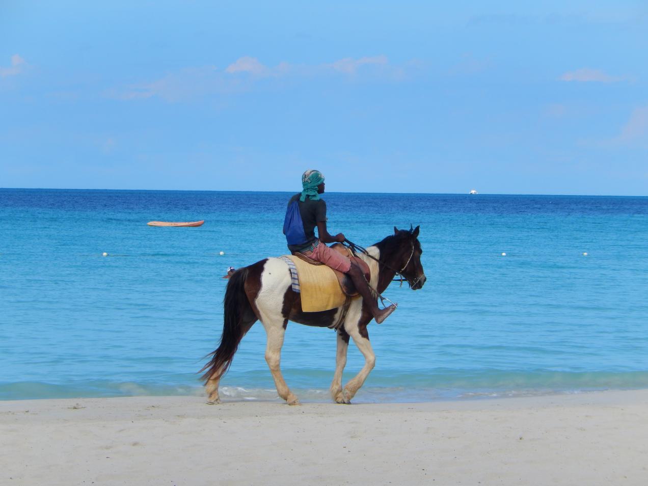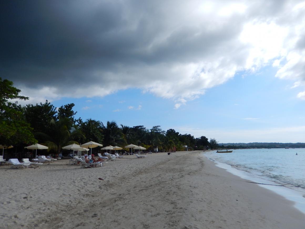 Actually there was a good one but we didn't get to see it. You see, when we asked our driver Michael (Michael's On Time Taxi) where was his favorite spot to eat, he told us about a little place downtown just around the bend from the Scotia Bank. He called it Econo (something or other but the name on the receipt was something else) and it was right across the street from the pier. You order at a window and pay, they give you a ticket and when they call out your number it is ready for pickup. There were a few table there but more across the street right near the water. I planned it so we would be there just before sunset. Unfortunately sunset wasn't visible from our vantage point, we were facing a little too much north and the extreme west end of the island blocked our view. Well, the food was very good and cheap. For $1250J Janet got a large jerk chicken and I got a brown stew fish. Both came with salad and rice and peas. It crowded with locals, so it wasn't the time or place to be pulling out the camera for photos of the establishment or the food.