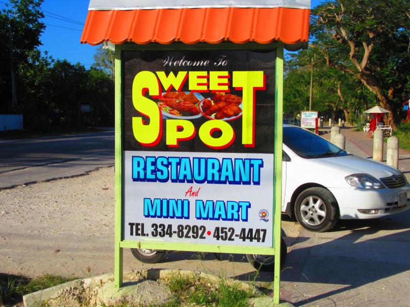 I walked (all of 4 min.) Down to Sweet Spot for something to eat. They have a menu on the wall which changes quite regularly. But tonight they had brown stew pork which I really like. I got a small box with rice and peas and "raw veg." - coleslaw without dressing, for $400J .