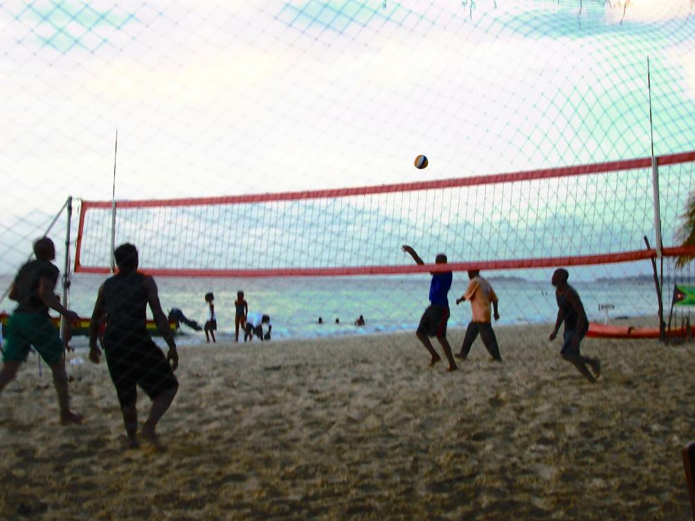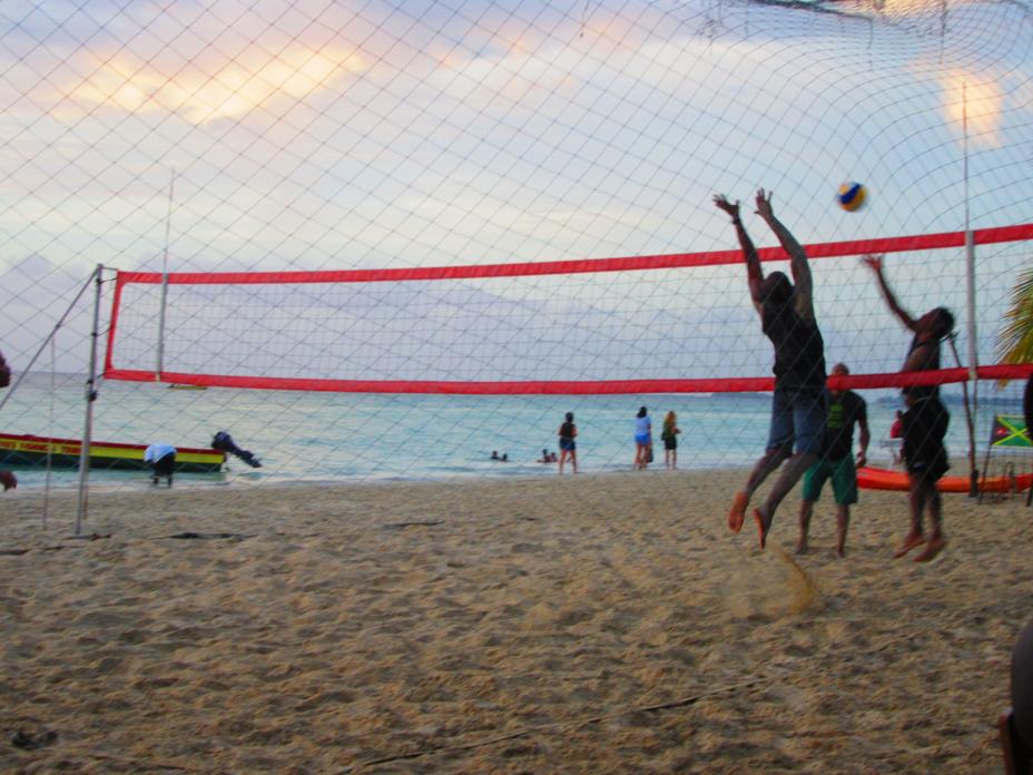 The nets were up and these guys were playing on the wet sand.