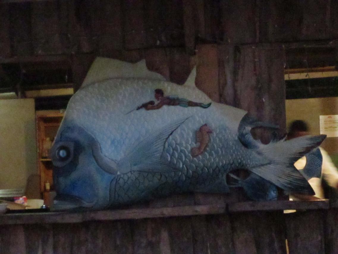 Big up on the painting on da sign!! Wood craving of the spear fisherman and the fish very nice!! Food got mi drooling! Good portions too!