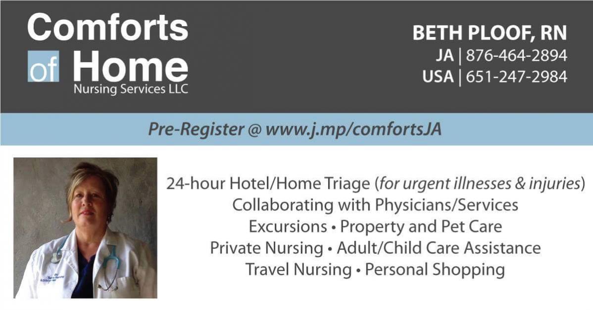 www.j.mp/comfortsJA I always recommend travel insurance of your choice and having cash for services (most services that come to you require CASH) but the travel insurance benefit becomes useful AFTER an event happened! I will do nursing triage to care for you, assess the situation and even refer you on to services I trust. I have traveled with clients to other cities per their request to facilitate processes and been their patient advocate for appropriate care! You must know where to go and what is best according to your specific need, as well as what services are available then!