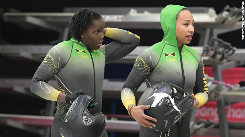 Jamaica's Jazmine Fenlator-Victorian (R) and Jamaica's Carrie Russell walk off the track after the women's bobsleigh heat 2, which has put them in 18th place.