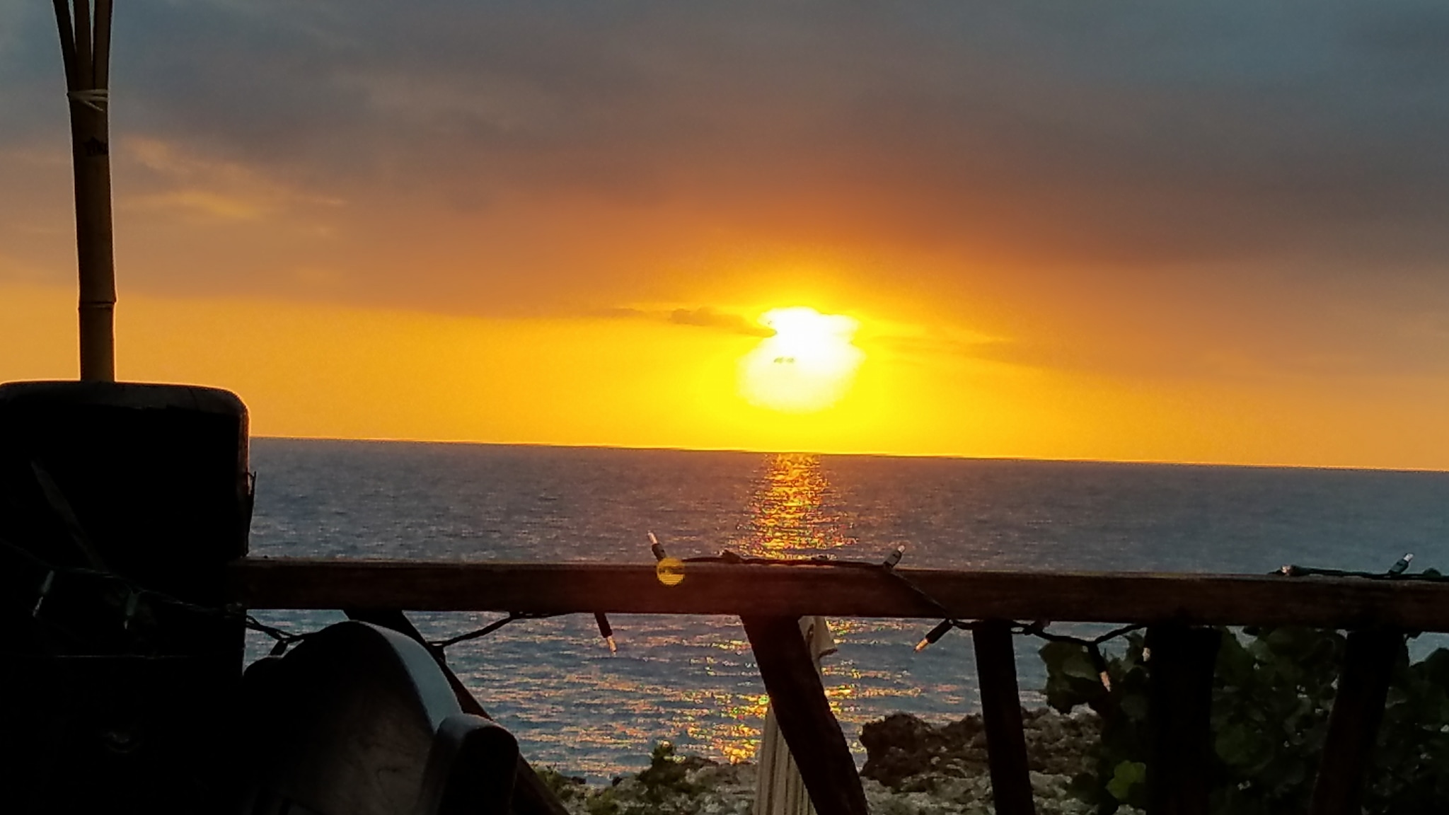 • Saw a beautiful sunset after a NASTY downpour (I think it rained hard every day for at least 30 min each day). Ate a fantastic meal of curried shrimp, fish and veggies next door at Sun Beach. Early to bed, as usual for us, and up at dawn the next morning