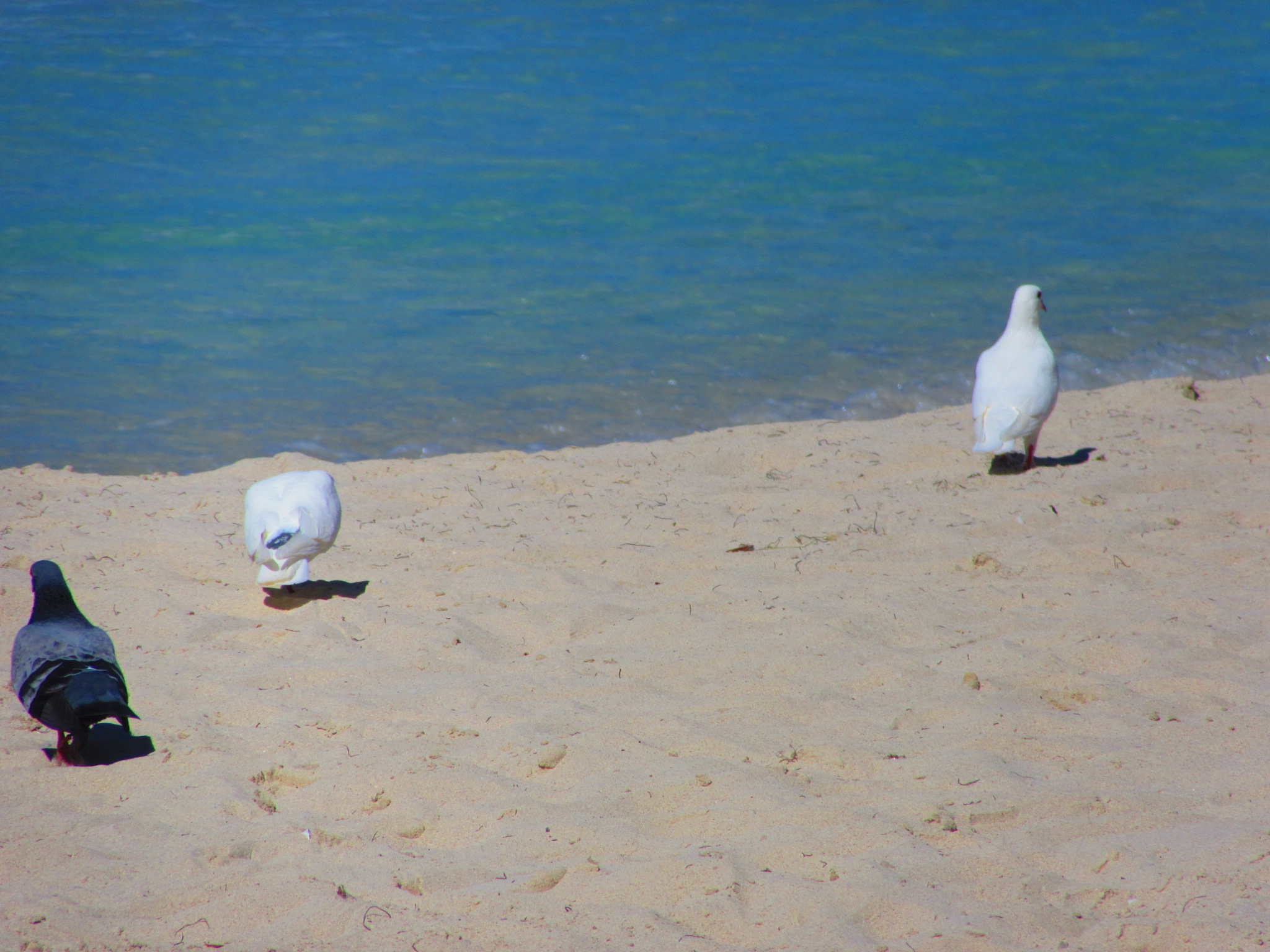 This pair of white pigeons have been together for the past three years. I have been "stalking" them. Yes, they are the same ones because one has a distinctive mark on his/her lower back.