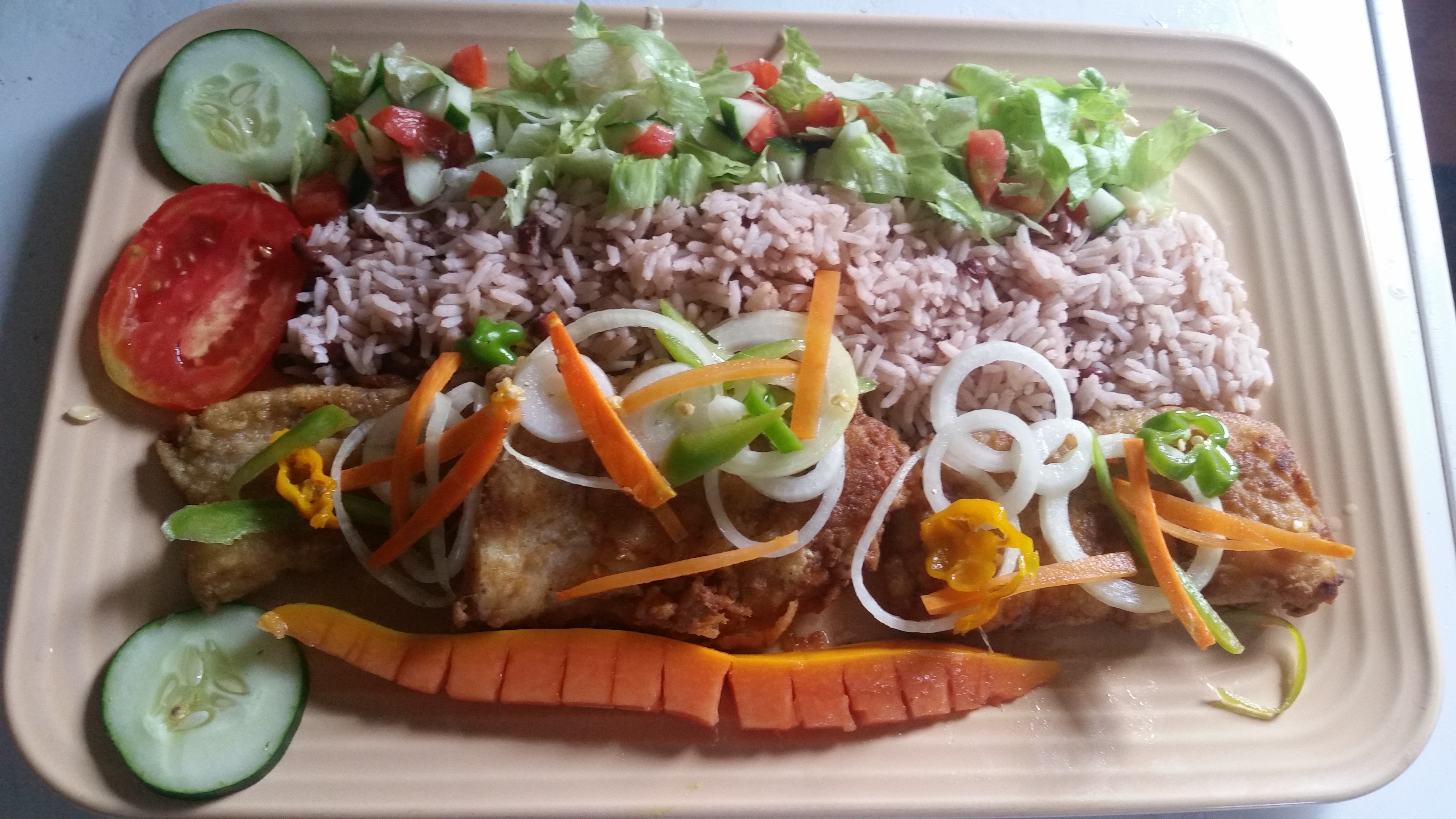 Lunch today at Quality Seabreeze restaurant and Bar fresh Snapper escovich with rice and Peas and salad
