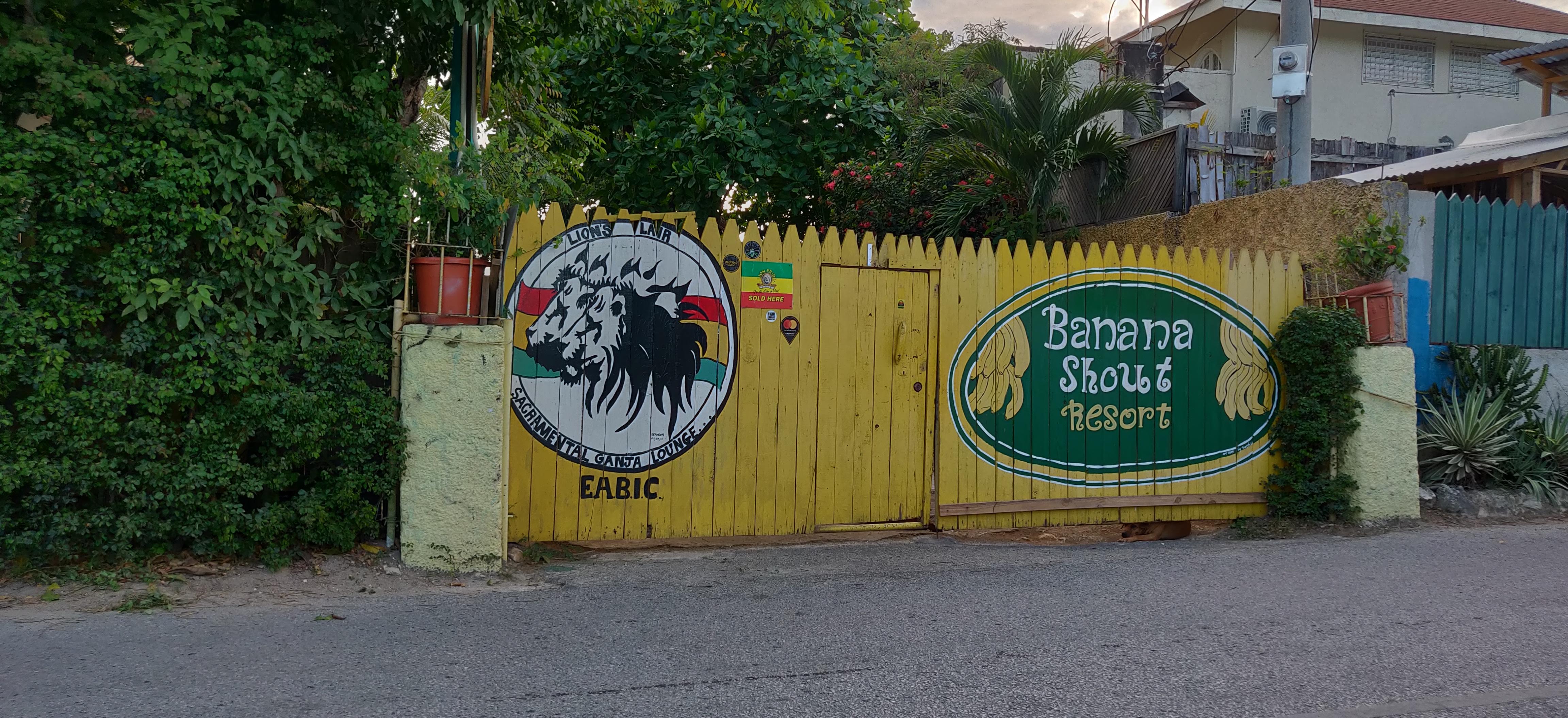 Banana Shout advertises on their gate that they're open 2p - 7p. I found that to be hit or miss. Was in Negril end of April into May and Stopped by 3 different times. The first time someone eventually came to the door and he had two kinds (I forget the strain names) as well as some black hash. It's pricey at $10 per gram, but it was pretty good. I assume that if buying more than a gram or two, you could probably get a deal. I was shown around the lounge, which is just a covered table and some chairs. They had scissors and papers and lighters available for use. There was a branch of what I was told was "homegrown" on the table, they told me I was welcome to try it. It was still a bit wet and didn't burn well but was better than what they're selling on the beach. The other two times I was told to come back tomorrow. We were staying at Catcha and could see right into the property from our room, and there's not much happening there.