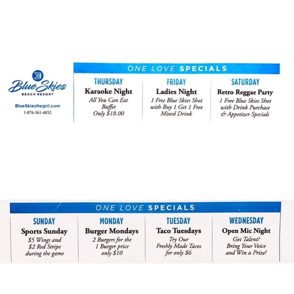 Blue Skies is the former Mariposa, and here are the current daily specials.