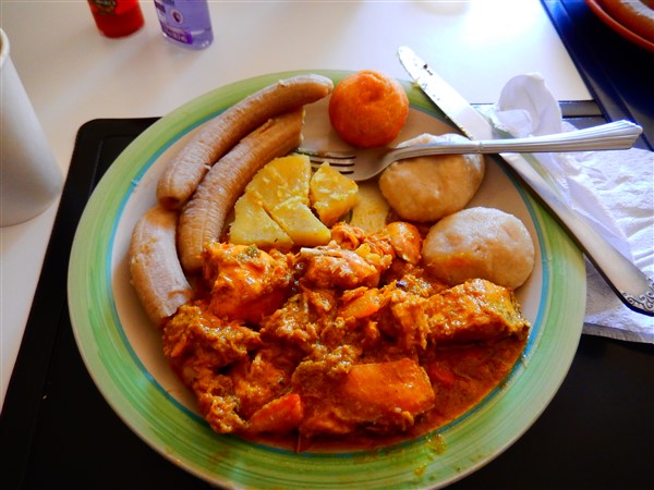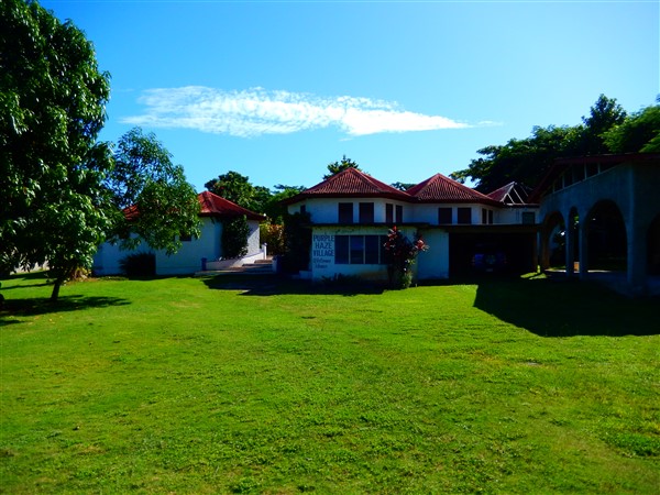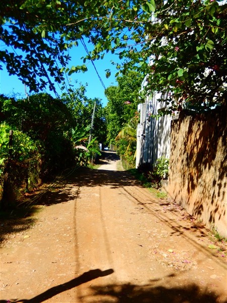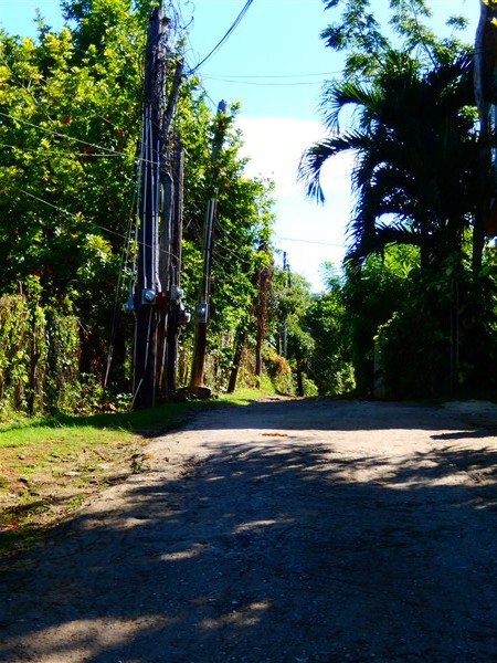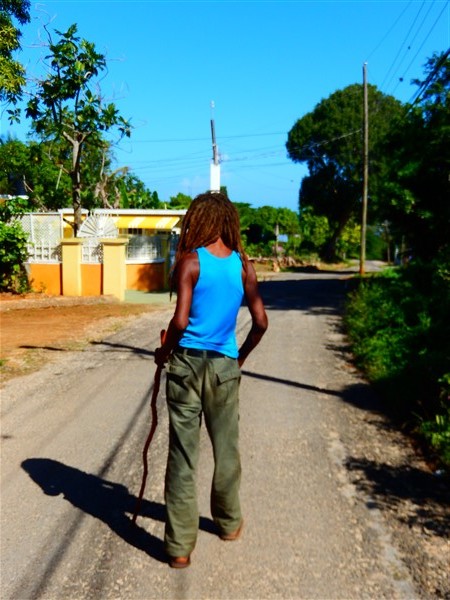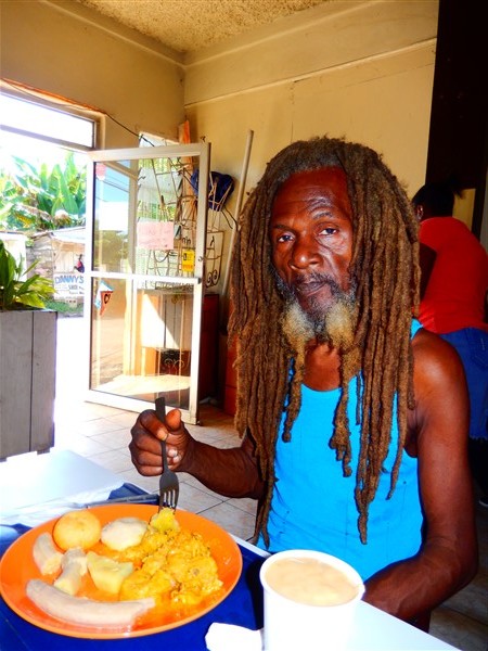 About 10 years ago we met Markie up in Red Ground and he took us down in to Porter's Cave. We continued that tradition for a number years often taking newbies. It has been a few years since we have been in the cave, but we have replaced that with walks deep into Red Ground. This year we found Markie ailing with a badly swollen foot and he had to use one of his hand caved canes to get around. His hand was also so swollen that he couldn't open a soda bottle. So we took a short walk and taxied downtown for a late breakfast. Markie picked the place, a little restaurant on the road headed up toward Red Dragon. Markie and I each got curried chicken and porridge and Janet had coffee and ackee and cabbage. Of course it came with dumplings (cooked and fried) and boiled bananas. A whopping price of 1550 J!!! Markie ate what we couldn't finish. He is so thin and probably not eating regularly. He told us the doctor said he was having kidney and liver problems and we didn't think he looked too good. We made plans to take him out for dinner on Monday. We gave him enough money for the walk to tide him over for a few weeks. This year we brought him sneeker, a set of sheets, towels and a few shirts. At 61, he is aging rapidly. I hope our friend Markie is still around for our next visit.