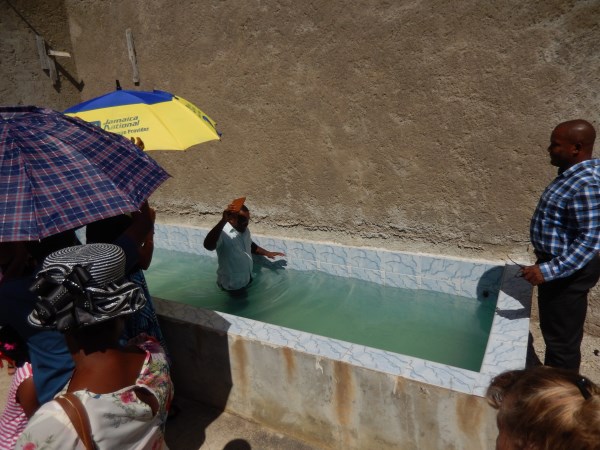 Going to church while in Jamaica is an adventure. It takes us 3 route taxis and about 45 minutes to go the roughly 36 KM to Strath Bogie, on the other side of Sav. We started going there almost 10 years ago. I have written other stories about Calvary Baptist Church of Strath Bogie for Negril.com. One post got the attention of a pastor from Michigan that was looking for a church to partner with in Jamaica. That church has sent down numerous people and money to help with evangelism, vacation bible school and food distribution. We always get a warm welcome when we visit. Every time we go we see something new for the first time. Once it was giving a parishioner change from her offering. Another time it was an agape feast, what we might call a Baptist pot luck. We were there 2 Sundays this year. The first Sunday they had the ordinance of communion. Now we have taken communion many times, but this time it came in an all in one disposable package with the wafer on top. The next Sunday we saw our first Jamaican immersion baptism. What a nice day spending time with other believers. Another thing we did before our trip this year was make up a gospel tract with a photo that I had taken last year. We gave them to taxi drivers, waitresses, shop keepers and other people we met. It is a catchy little title: “How to get to heaven from Negril”. They were well received.