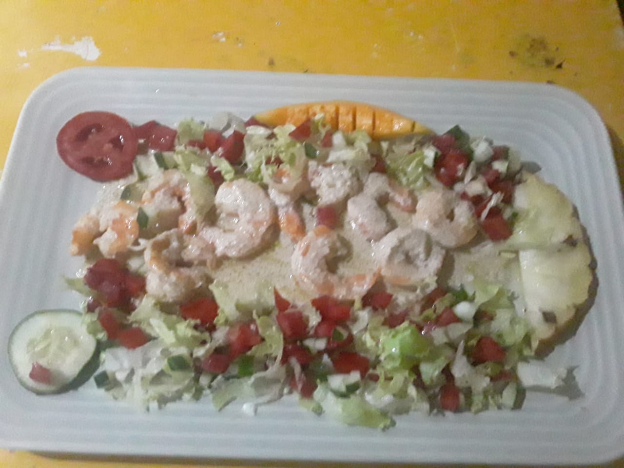 A freshly prepare meal shrimp cook in coconut cream with vegetable salad