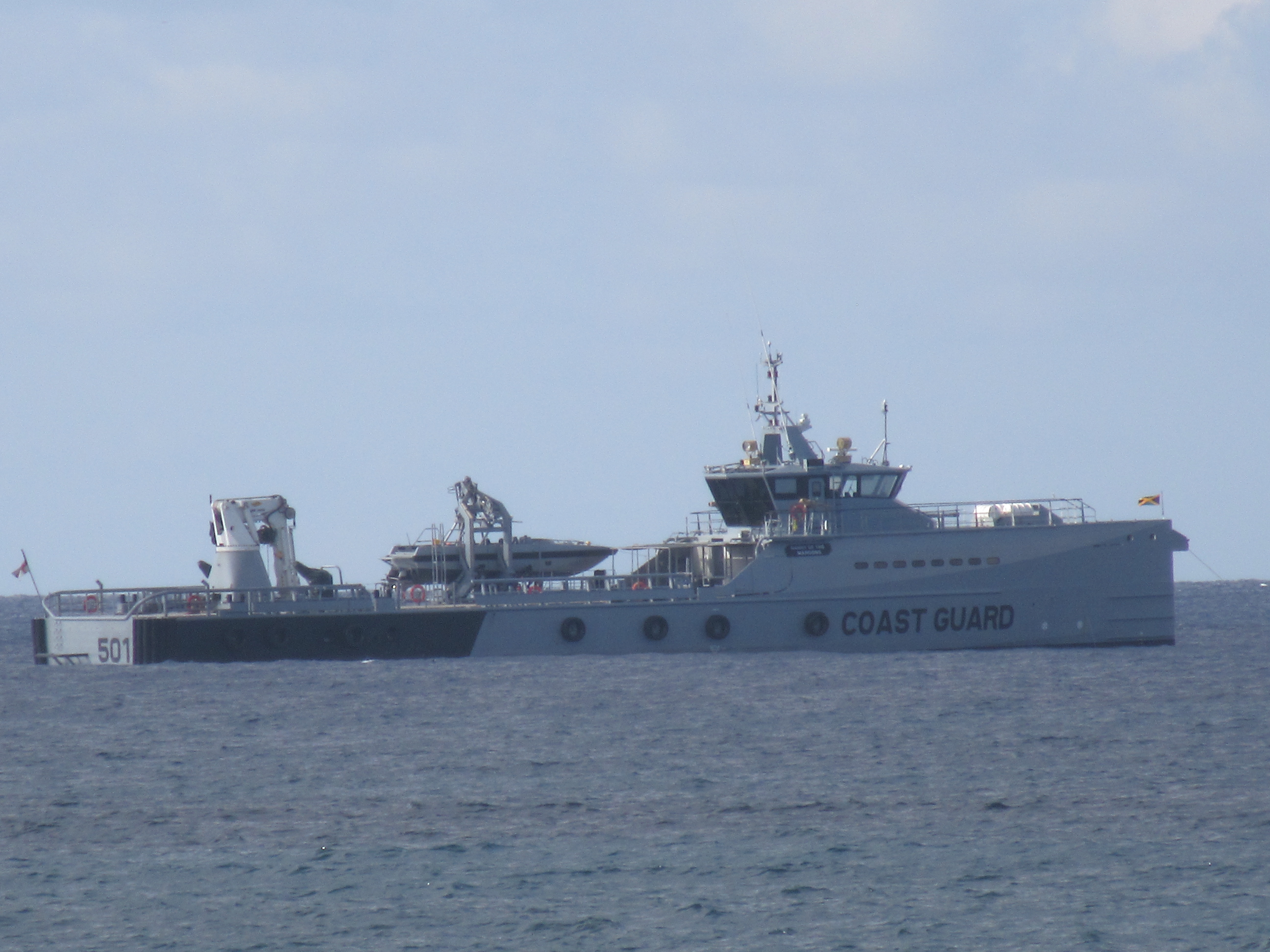 Say hello to the newest ship in the Jamaican Navy, HMJS Nanny of the Maroons, currently parked just outside the reef off the coast of Negril. Not much on the web about this ship but by the looks of her, she appears to be purpose built to launch and recover fast patrol boats.