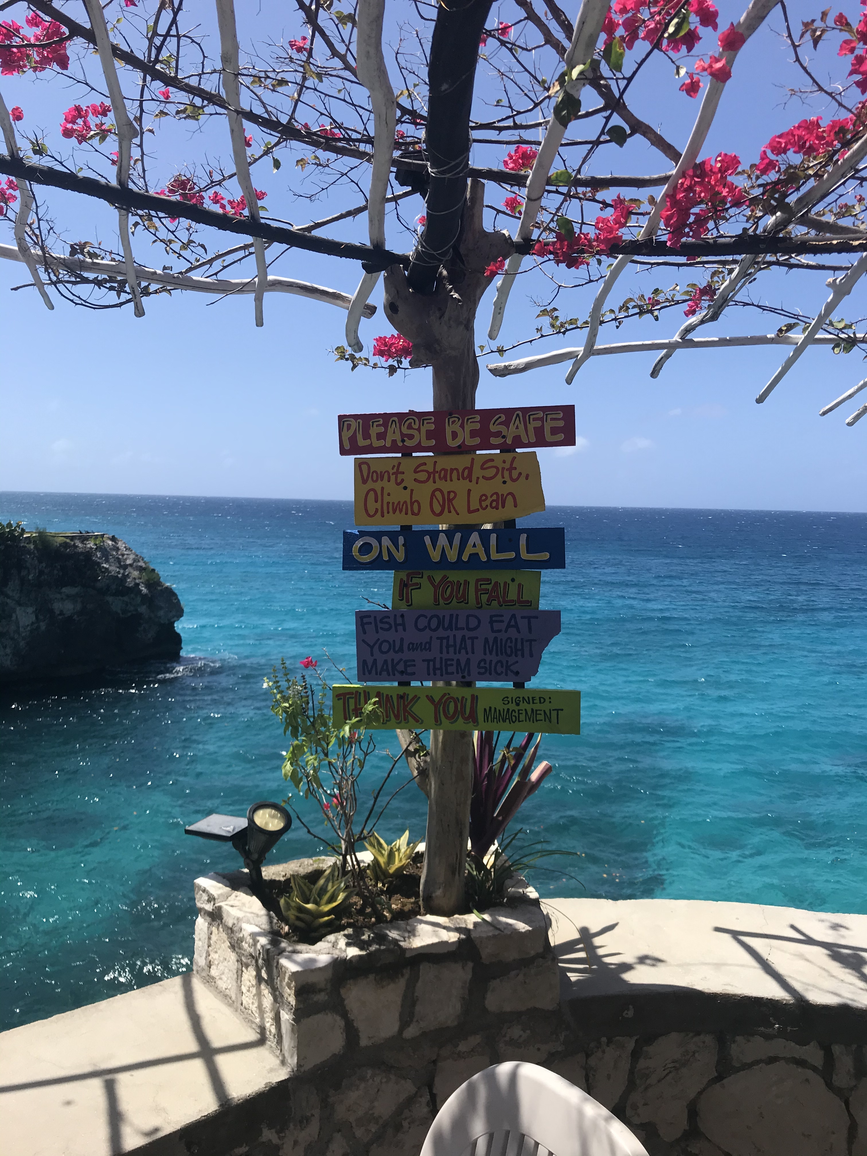 Looks like Luca has added a new sign at LTU and it's become a photo op. But he knows what he's talking about. Ask him about falling off that wall while trying to stretch a tarp over the thatch roof to stop leaking on the bar. This was before the renovation. Fortunately he missed the rocks, swam to the ladder next door at the Villas big house and while everybody (including his wife) was screaming and looking over the edge for his body he walked in through the front gate soaking wet and wondering what all the commotion was about. There is only one small window where you can hit the water over sand and not land on the huge boulders just below the surface and that's where he landed.