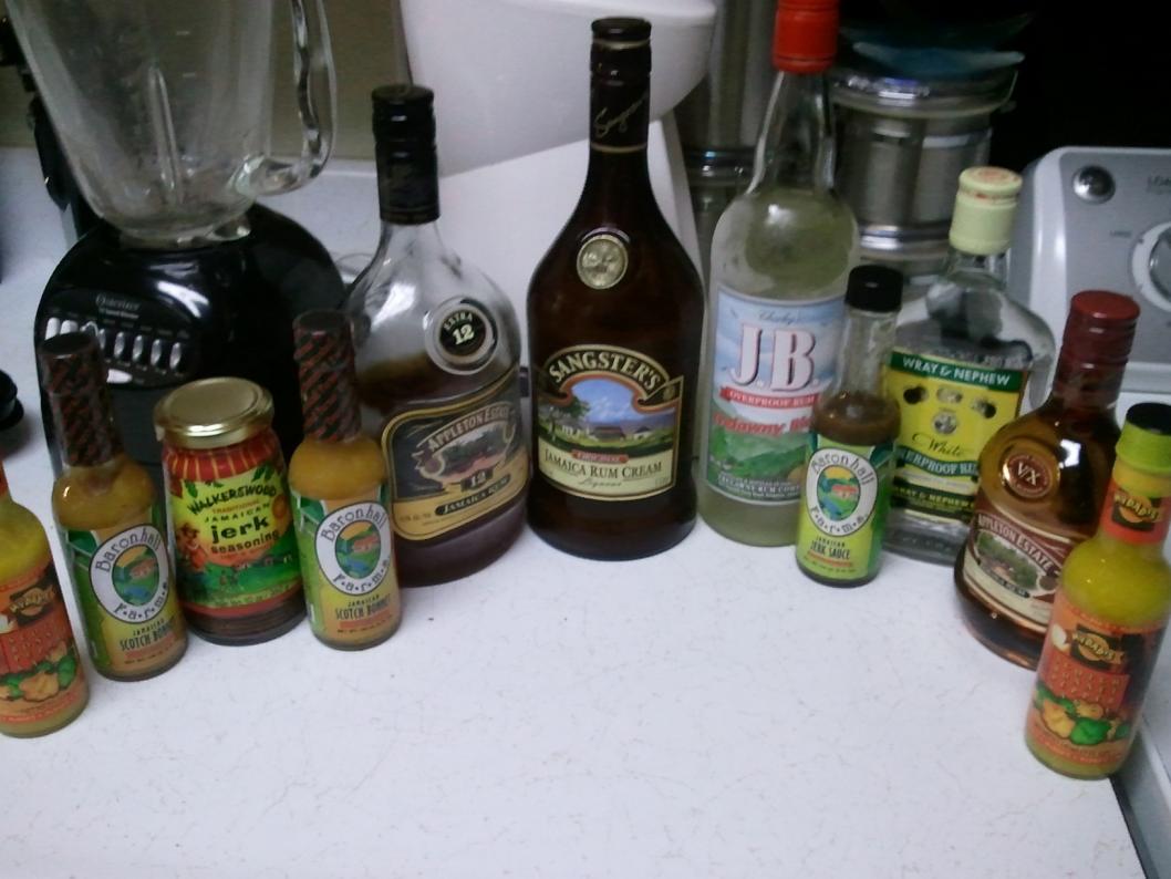 One lesson I've learned from my trips to Jamaica is to bring some of the stuff I enjoy home (not ALL of the stuff b/c you can get arrested). I would always bring a little bit on previous trips. My first trip, I had a bottle of overproof bust in my luggage on my flight home. Before the luggage came out on the carousel, I could smell the smell and knew exactly what happened before any luggage came out. My senses were strong as I was totally hungover from overproof rum punches at Bourbon Beach. Needless to say, everybody was pissed because everyone's luggage reeked of overproof. I always felt bad but was able to blend in because it was everywhere and the culprit couldn't be identified. Oops! On my second trip, I had my hot sauces thrown away by MBJ airport security and then my unopened bottle of rum cream fell out of my fridge and busted all over my kitchen floor. My 13 year old akita (R.I.P. Nina) happily licked it up off the ground and got buzzed. At least she enjoyed it, I let her have at it after removing the glass. But I found that the little bits you get to enjoy at home do help. So this time I did it right. I brought home an arsenal, a liter of Sangsters, liter of Appleton Extra, bottle of JB, few bottles of Jerk, few bottles of scotch bonnet hot sauce and a couple of little Appleton and overproof bottles: