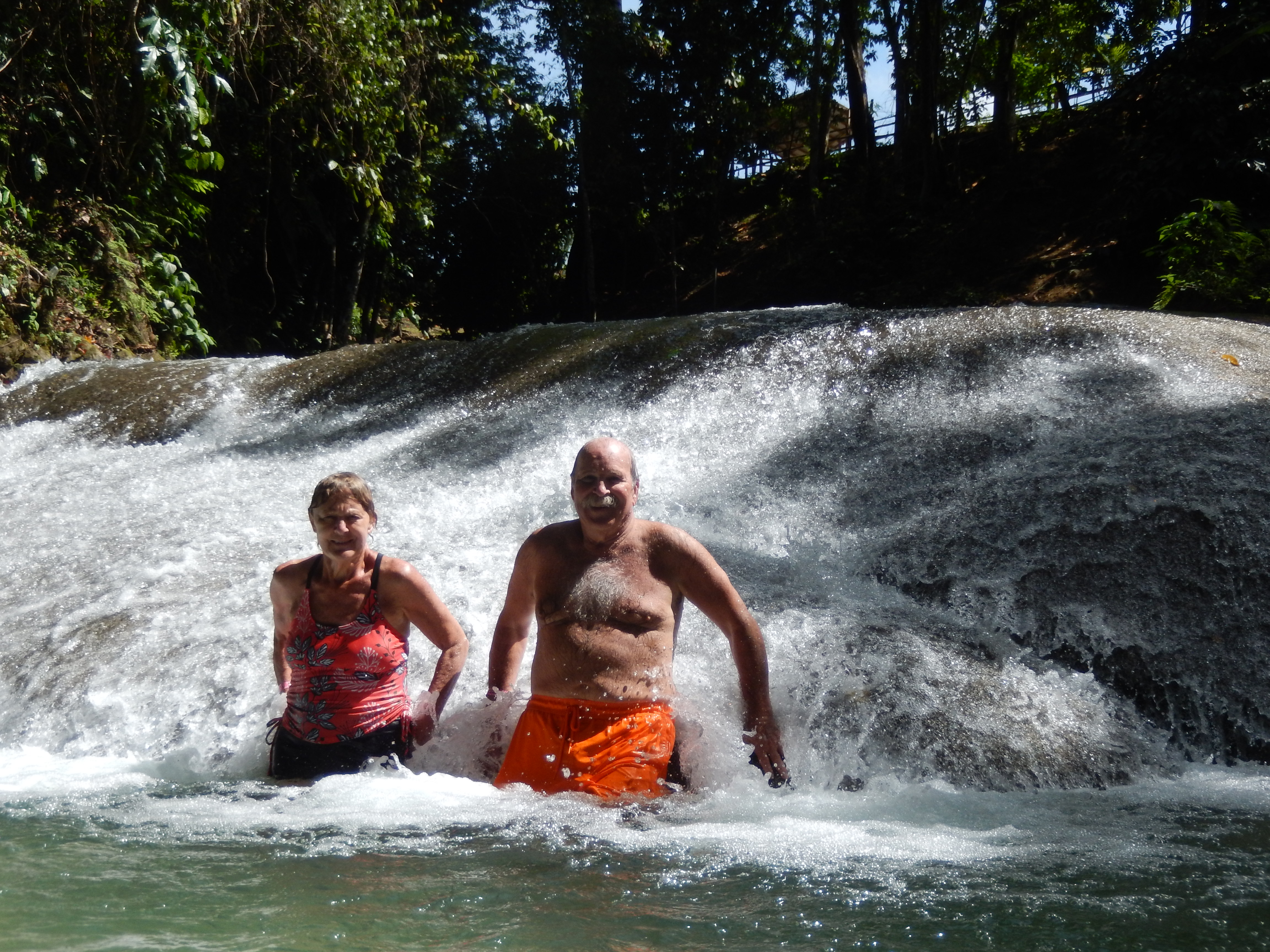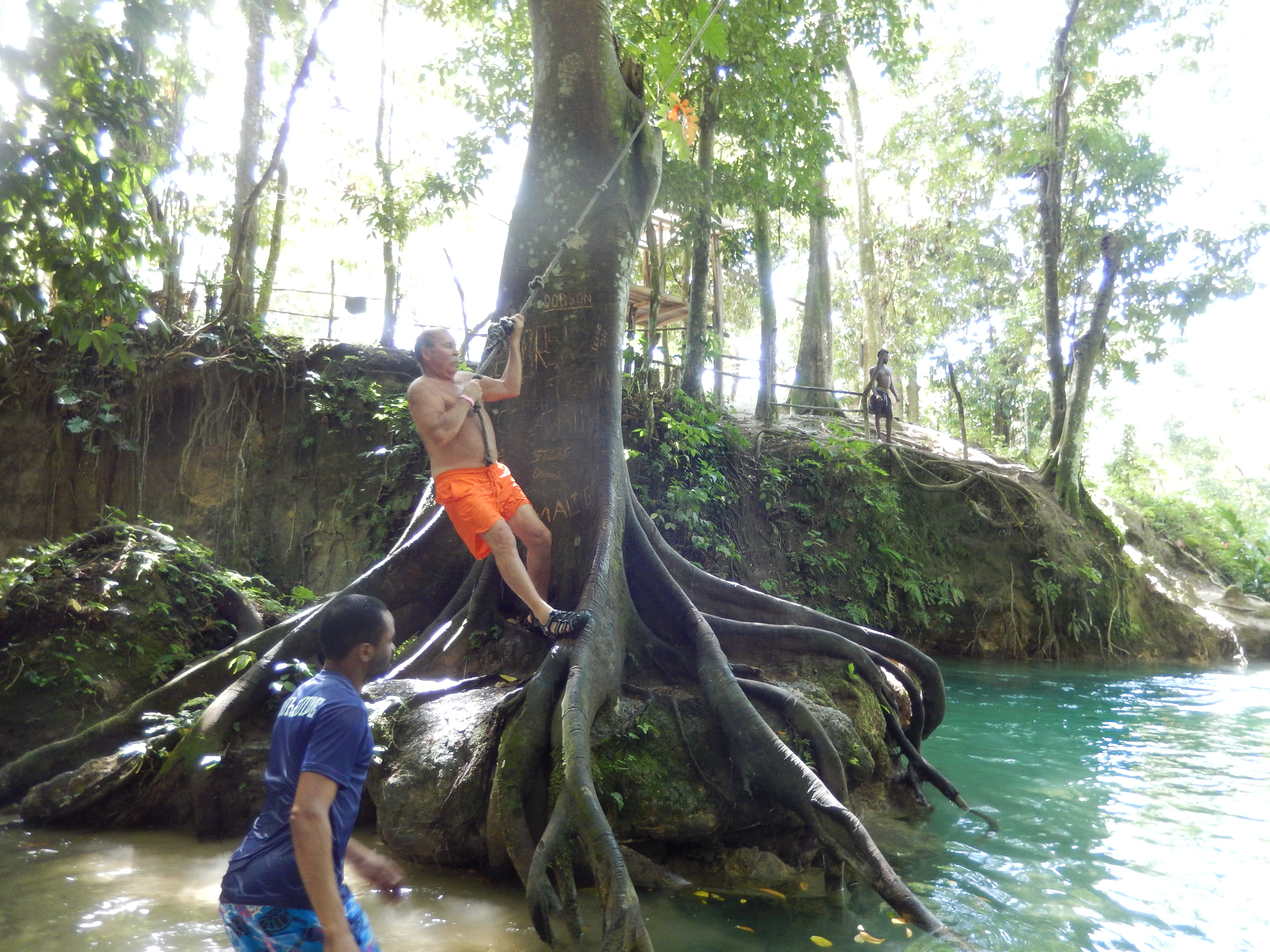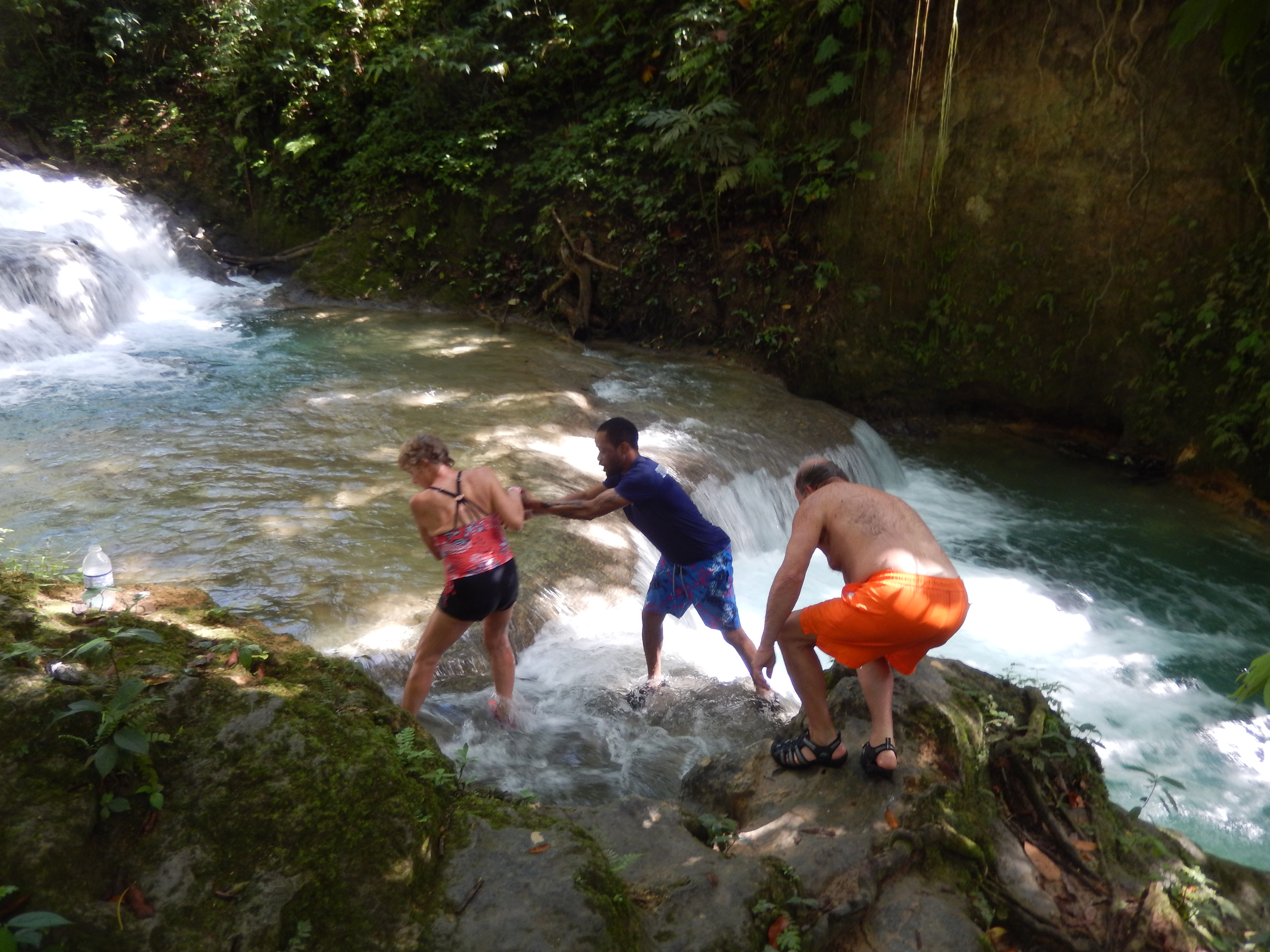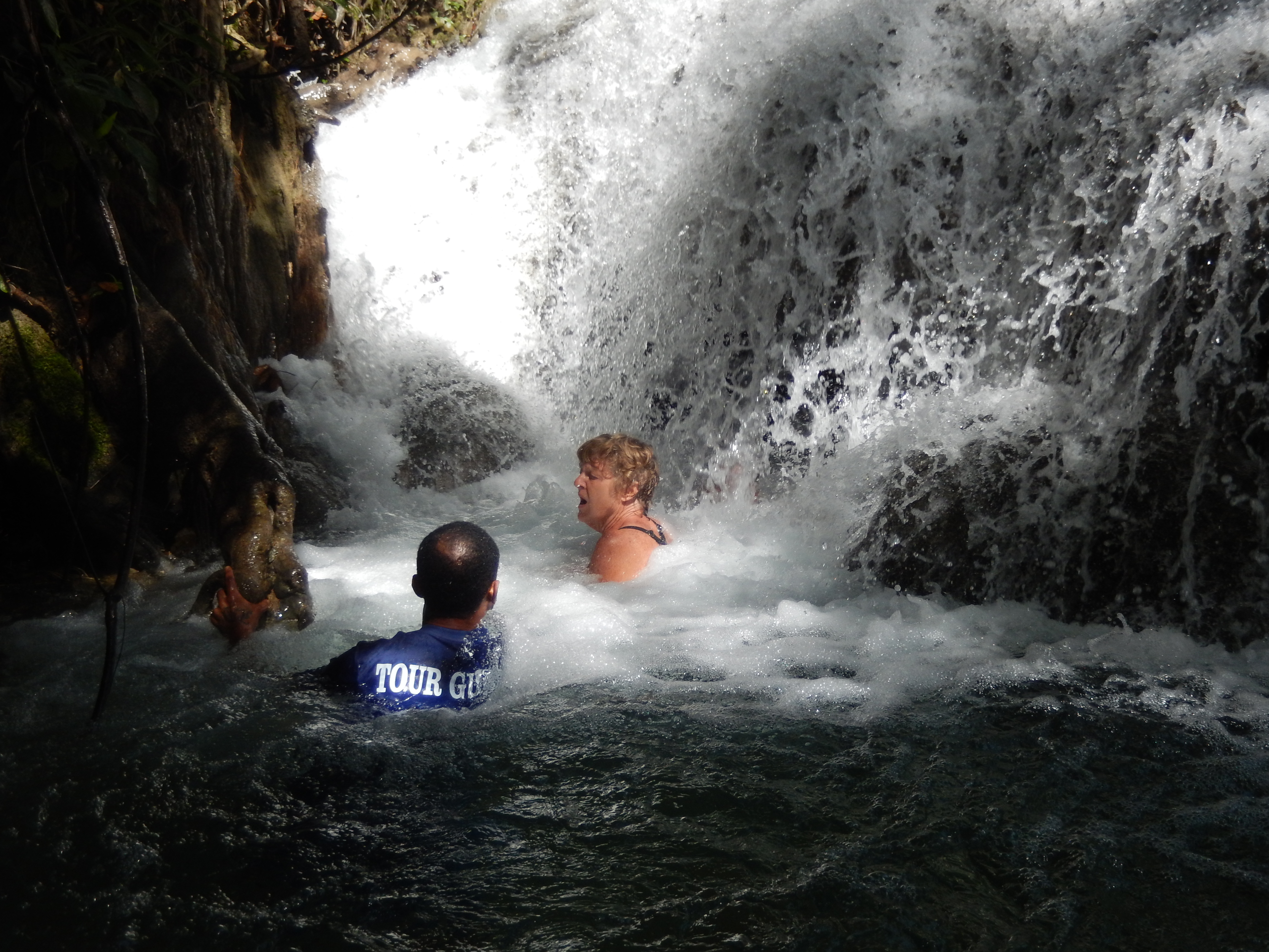 Over the years Janet and I have been to most attractions on the west end of the Island. Some of them don't exist any longer and many we have been to multiple times. But this was the first time going to Benta Falls. We contacted our driver and he said it was best to plan an entire day for the adventure. In fact he was bringing his swimming trunks too. Although I had been told that it was close to Sav, that didn't seem to be the case. It is quite a drive in the country to get there especially if you are taking it at a leisurely pace to enjoy the surroundings. We arrived by 10:30 and went to the changing\bathroom area to slip on our trunks. We took to the falls what we thought was best and locked the rest in our drivers car. You get a tour guide to take you through the falls, much like Mayfield Falls. The entrance to the Benta Falls complex is at the top, so you walk down a long path to get to the streams entrance. Not knowing quite what to expect, I had on my hat and glasses. Mistake number one, you will loose them! I also had a nice Nikon point and shoot camera and also a waterproof camera. Mistake number two, don't take a good camera unless you have someone who will carry it and take photos for you. Fortunately our driver not only wanted to get in the water, but he was way more sure footed than me and actually like taking the photos for us. And the waterproof camera I took.....it slipped off my wrist at the third small falls and was gone. Mistake number 3, be careful even it is wrapped around your wrist. Our guide was very cautious for us especially my wife helping her navigate the many pitfalls in the stream. I just followed in their footsteps. We got up to the rope swing and of course I had to take a try. At least I didn't make mistake number four, but it was close. When the guide tells you to “let go” you better or you will end up smashing into the tree. A little farther up is a small falls that you can get behind. Very cool, but it is not a big falls you are under. Eventually you get to the end and climb the stairs which takes you to the entrance area. We ordered lunch and I was surprised that not only was it very good, but it wasn't even expensive. After a leisurely lunch we changed and headed back to Negril. Total trip including driving about 6 hours. Our guide was from the west end of Negril and I asked him how he got to work. His reply was “3 route taxi's and lots of time “. So it is possible to do this trip on your own, but it could make for a long day.