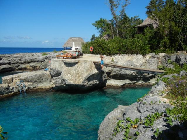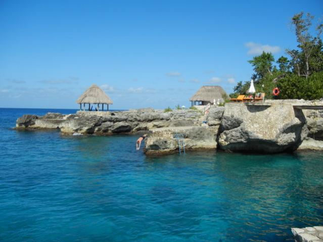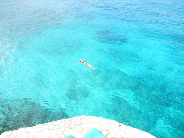The little thatch roof cottage was super comfortable and jumping into the clear aqua water was sooooo much better than wading into the shallow water on the beach. I loved climbing out on a ladder and returning to my chair without a crust of sand on my feet. We also really liked how free it felt to jump in and not have a rope line limiting how far we could go in any direction. For swimmers, the West end is definitely the best end.