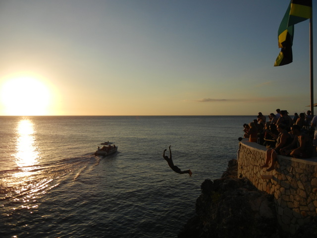 We walked down past the light house to Whoopies one morning and then down to Push Cart the next. Easy walking in the morning, not thinking I want to do it late and/or drinking due to the narrow road and zooming cars. Before eating at Ivan’s on Sunday we decided to go to Ricks for sunset, have a few drinks, enjoy the divers and see the live music like we had done on previous trips. I’ve always defended Ricks as not being a rip off because you get live music without a cover charge and the divers work on voluntary donations. However, this night there was no band, the usual divers seemed to be mostly absent and the bill before tip was $21US for two beers and a plate of chips & dip consisting of maybe 14 chips. The service was very good and friendly, but add me to the “Ricks is a Ripoff” list if this is the new norm. I liked the youngsters working the crowd for diving tips from the rocks along the wall toward Banana Shout. Got a picture I really like of one of them leaping.