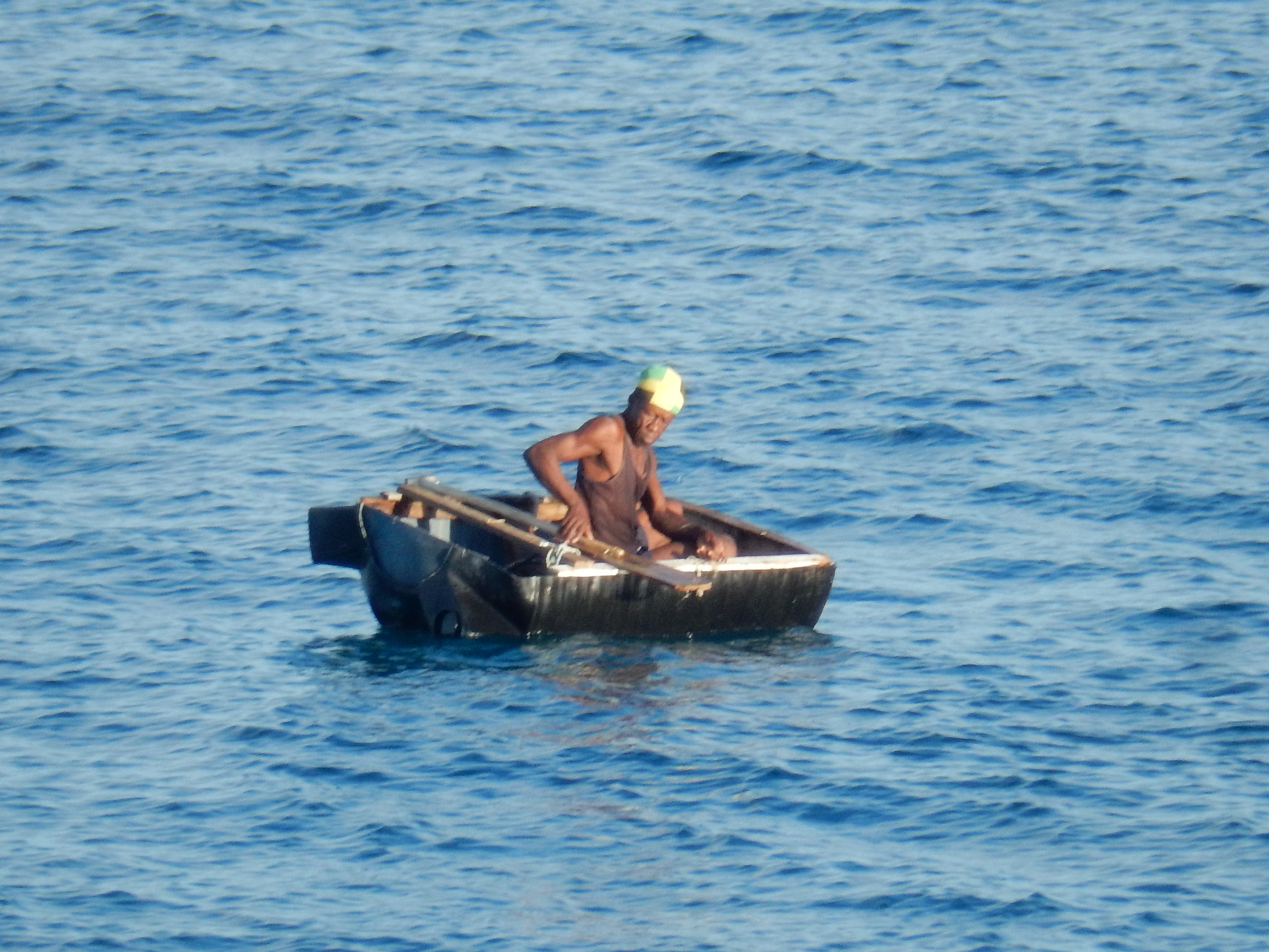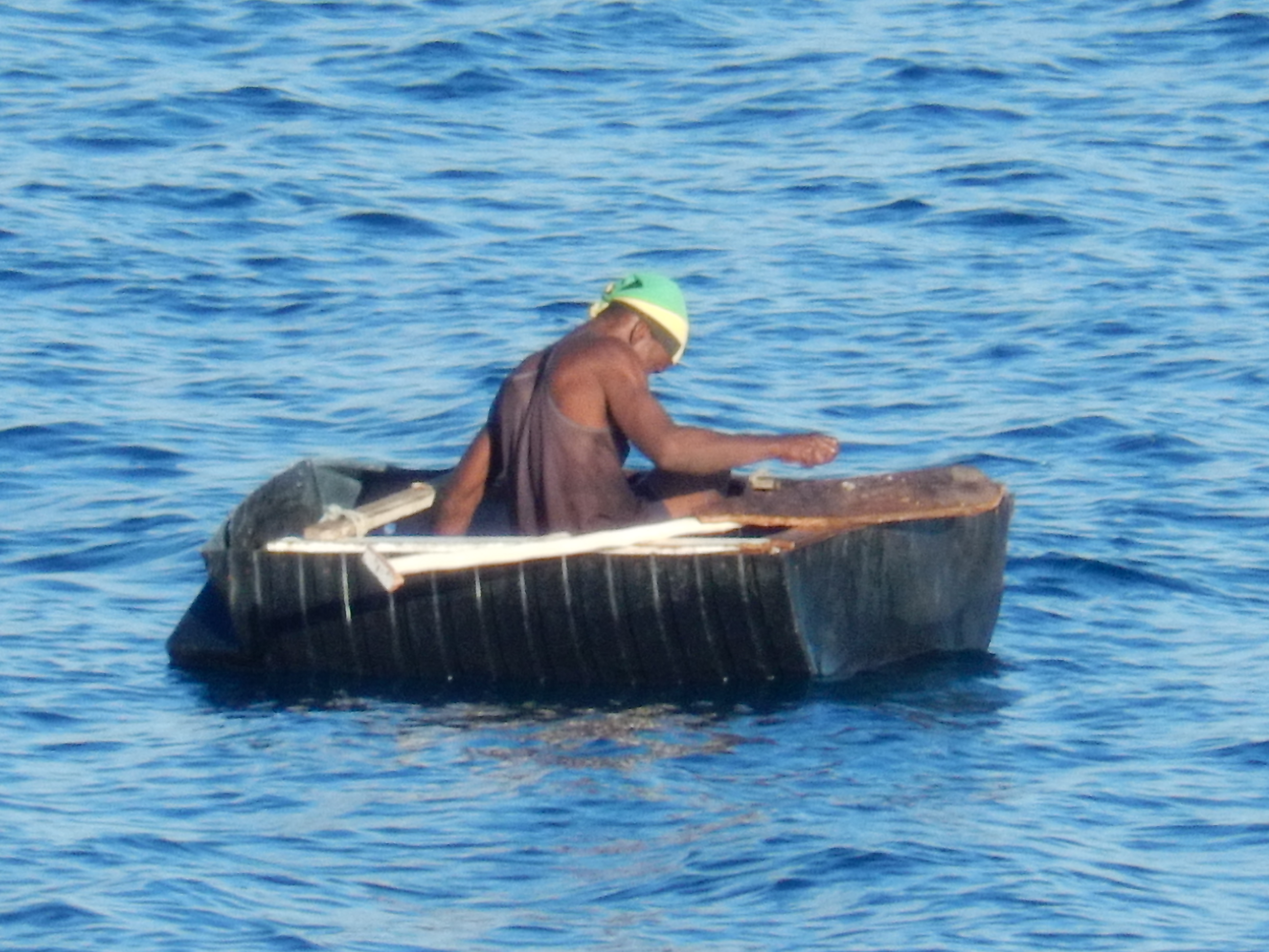 There were at least 16 fishing boats out on the West end this morning but this one really caught my eye. At first I thought it was a bath tub as it was so small. Then I thought maybe it was a piece of corrugated pipe (because of the ribbing) that had ends welded on. After examining the photos I came to the conclusion that it probably was half of a black water tank repurposed as a small single man boat. He did catch a couple of small fish as I watched.