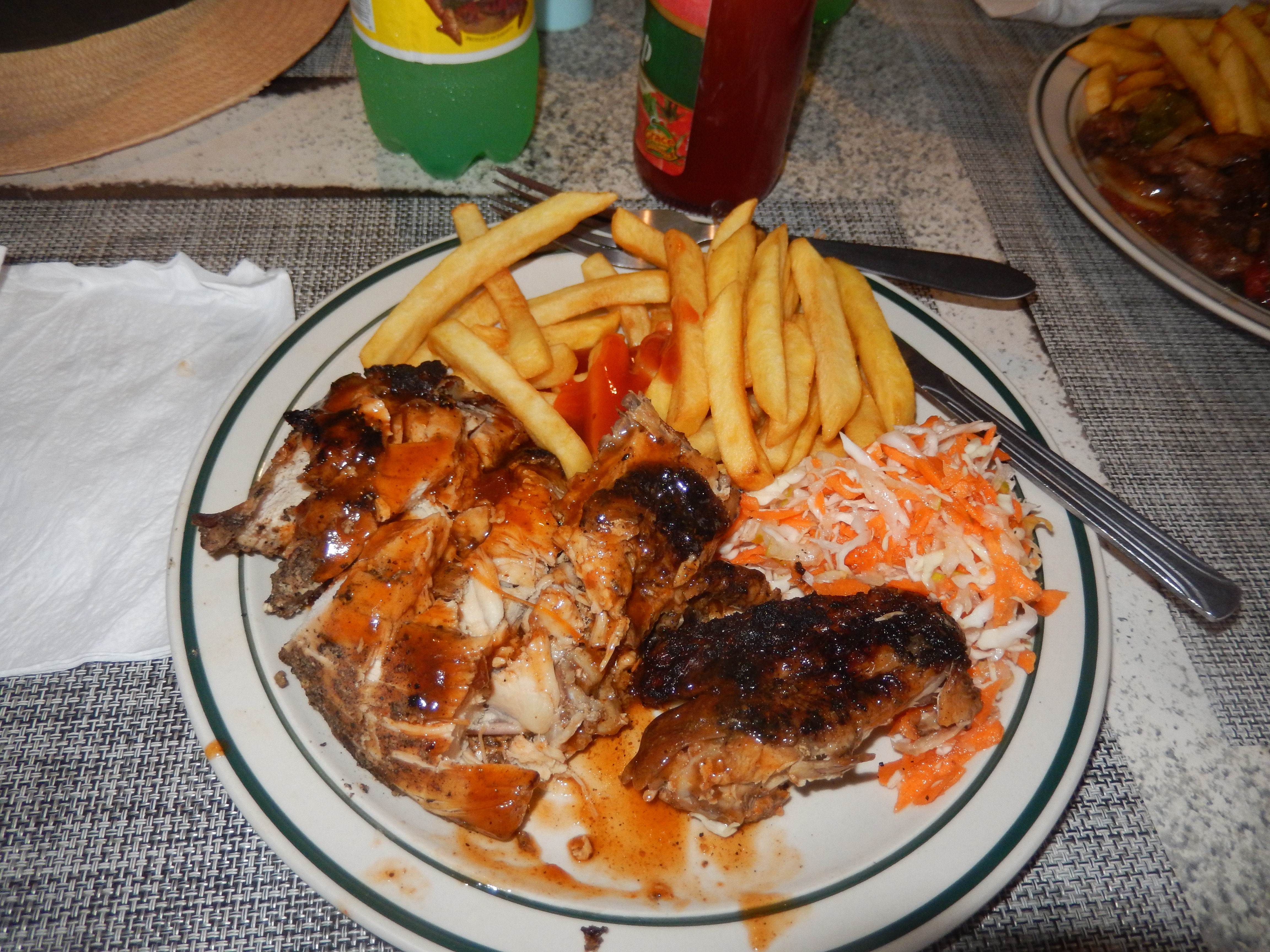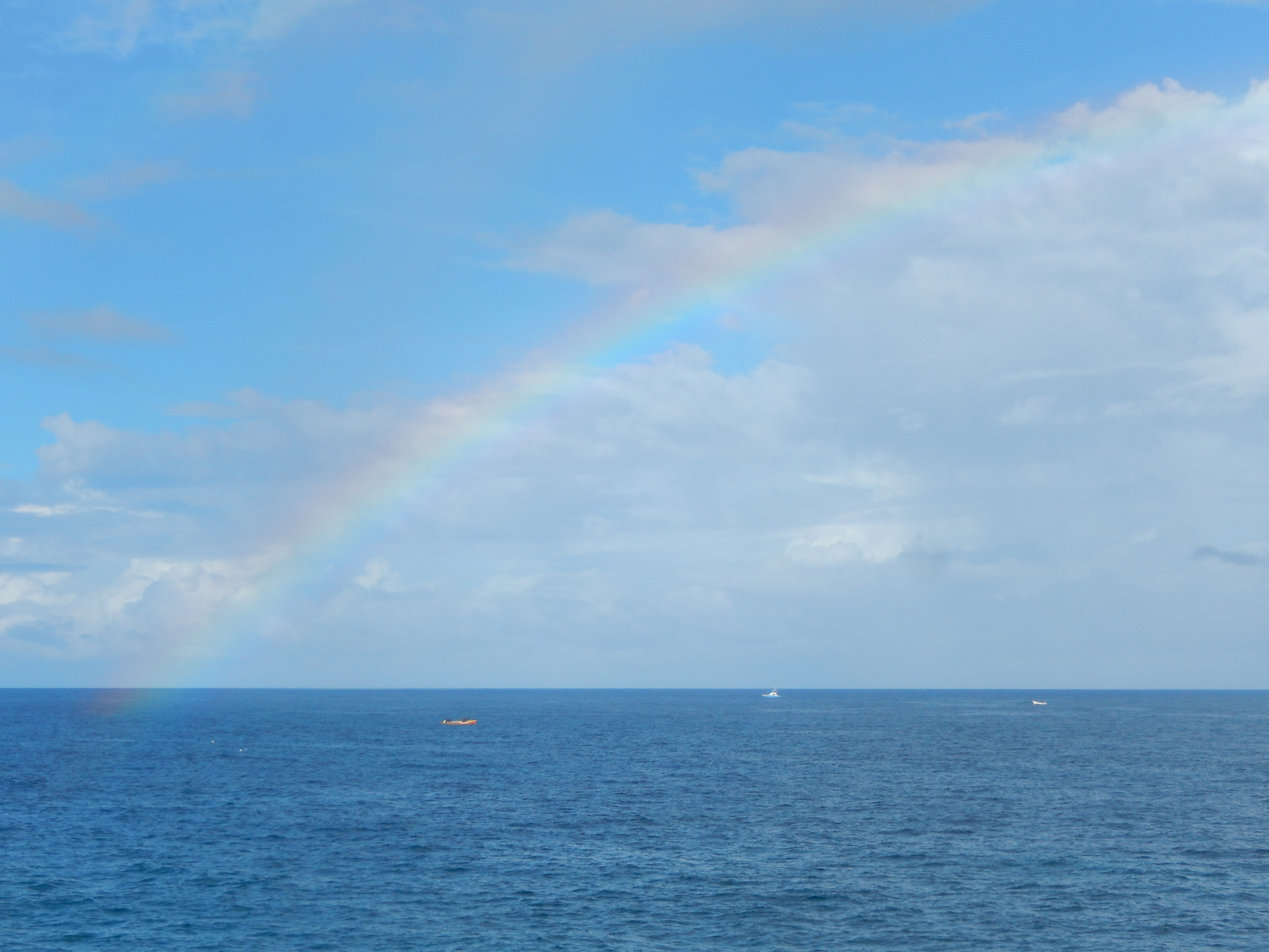 We headed downtown this morning to have breakfast with our friend Markie at Blossum's. Walking back we stopped at the Chinese Restaurant just up from Vinnie's....I think named Lim's. A local shop owner told us the food was good and inexpensive so we bought our supper at 11 AM this morning figuring we wouldn't make it out tonight. In fact a few places told us they were closing early because of bad weather. We did see a nice rainbow early this morning and the sea was already rough. The waves are crashing pretty had right now and there have been 2 heavy downpours since 1 PM. We are in for the night.