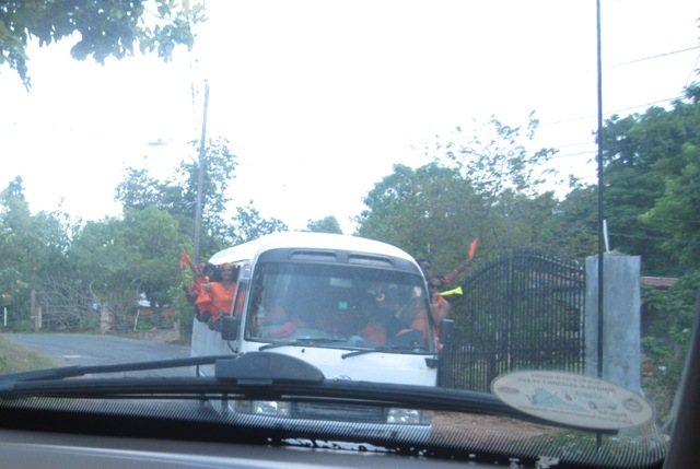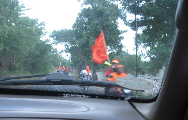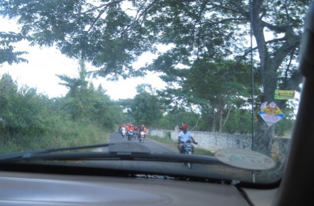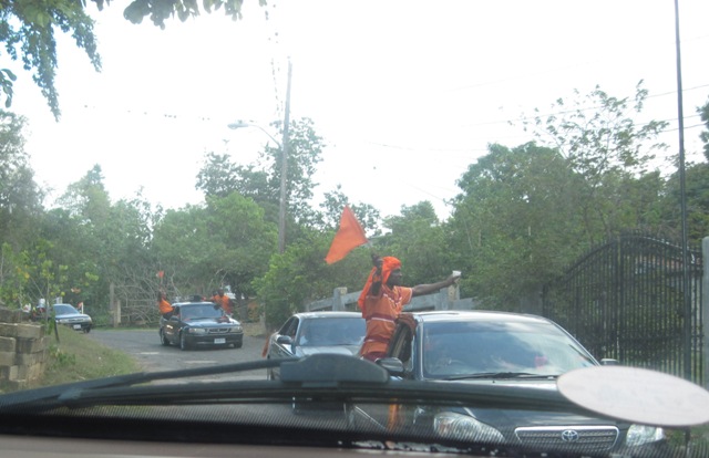 Driving the back way from town and we started seeing lots of ORANGE (color for PNP) and then a line miles long went by with bikes, cars, vans, police, everyting and it went ON and ON. One man by the road just put his hand on his hip and shook his head....one driveway everyon gathered waving and yelling....it was like a lroad rally. I also admire JA's use of transportation for marketing purposes!!! It was SO COOL. Seriously miles and miles long. WOW always something interesting.....