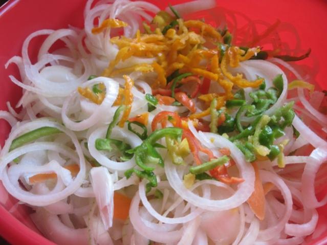 I made up a giant bowl of pickled escovitch veg (onion, garlic, carrot, sweet peppa and scotch bonnet) for the fish. Mr. added butter and stuffed all the fish with it and made foil packets to steam/roast on the grill. It was DIVINE. WARNING - wear gloves if you have a lot of peppas to chop. I mini-sliced almost a pound of peppa and that night my fingers were on FIYAH - felt like third degree burns for real. It took 12 hrs with my hand in a bowl of ice before it stopped - I was careful not to touch anything (lol) but LESSON LEARNED - ouch!!!! There were so pretty though (ha!).
