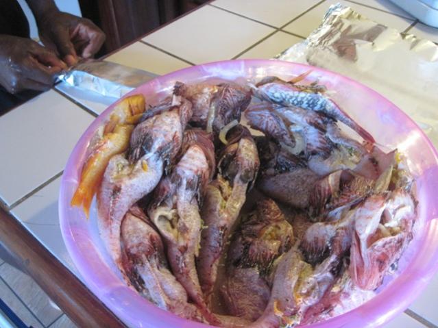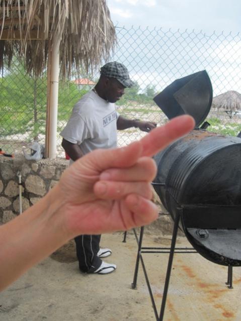 As you know I love to cook and chop and it was such a joy to prepare for my Soon Come Back party at the Westender. I had a super sweet helper thank goodness or I would never have pulled it off. Keith the manager got me 25 lbs of cleaned Lion Fish from Whitehall and I added some parrot and snappa that I got from a fishman walking down the road (lol) and also some chicken to jerk. Made rum punch with some sliced fruit in it (making sure to test it carefully to be sure the mix was right lol). Some of the crew stopped in to help taste test and I gave them a bokkle to share during the day.....again its odd but beautiful that its no big deal to drink on the job in JA (depending on your job of course but still....). They enjoyed their day and were a big help to me getting tables seaside and coal for the grill, etc.