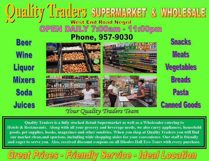 Attachment 8072 Quality Traders in Negril is on the left side of the road, just before the Hilo in the Sunshine Plaza. They have everything except cigarettes. Open 7 days a week early and late hours for your convenience. Very clean and well stocked supermarket.