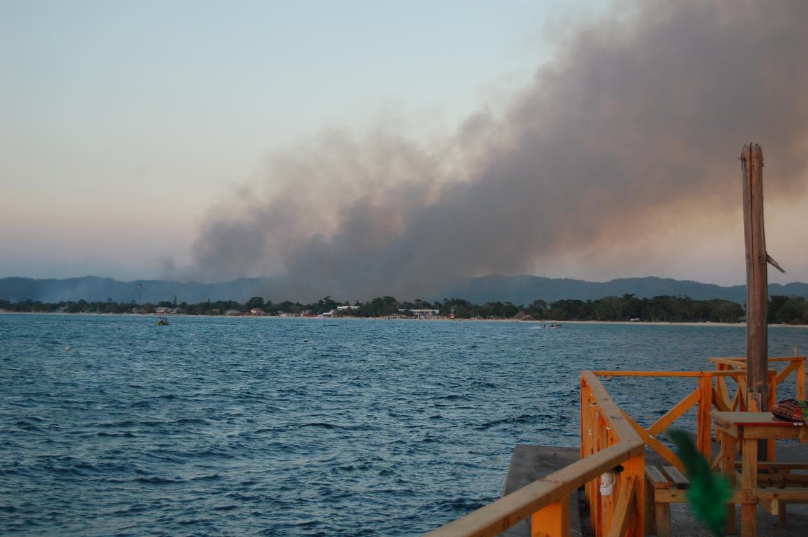 You can still see a little smoke towards the southern end of the morass. And it is very evident at sunset (that brown haze). Last night we could smell it in Hanover. It was not thick and is much better this week. As Rob noted, didn't see any along the beach road all day except where the jerk burners congregated. As long as we have a sea breeze, it is wonderful. Only when the winds shifted to be off the hills did we smell it.