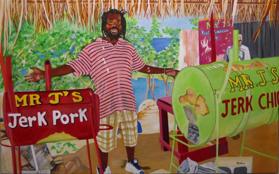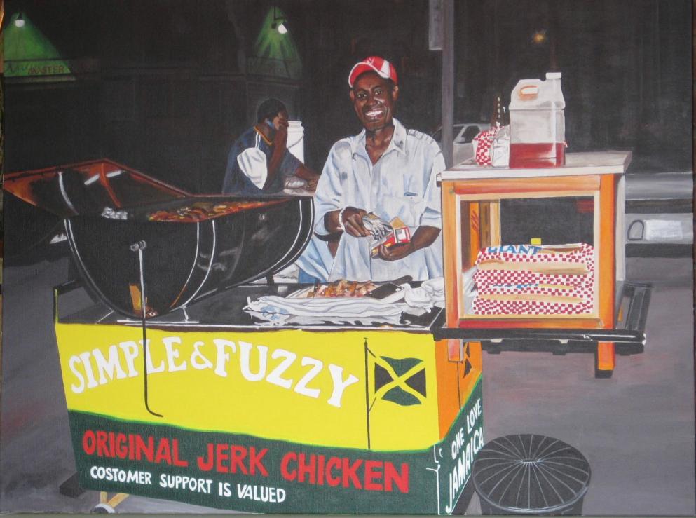 i've been traveling to jamaica for about 25 years now. as an artist i have been fascinated by the jerk chicken phenomenon. around 2004 i began to paint images of jerk chicken vendors.
