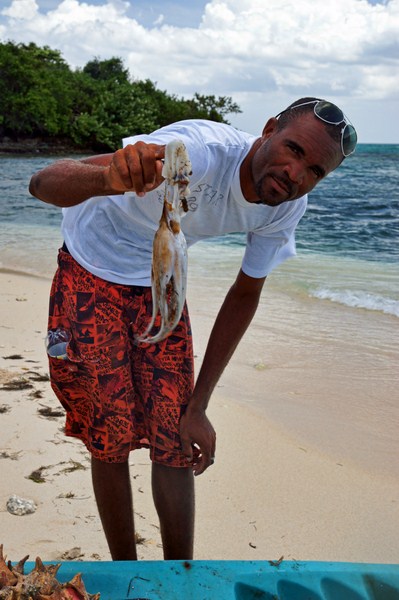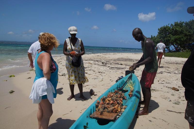 Famous Vincent also donned snorkel gear and joined the group for awhile after which he spent some time under the boat cleaning the windows and removing whatever grows on the bottom of boats. After everyone had enough snorkelling we headed to Booby Cay. There was a lady there with a stand who was selling wata, juice and some snacks. A fisherman was also there with his canoe and was busy cleaning his catch. After Booby cay we headed back to our resort on the beach and headed to the bar for drinks.