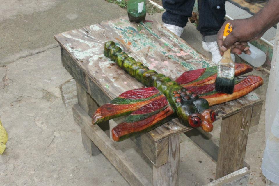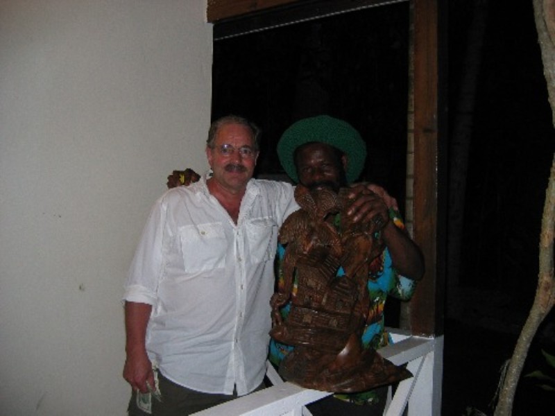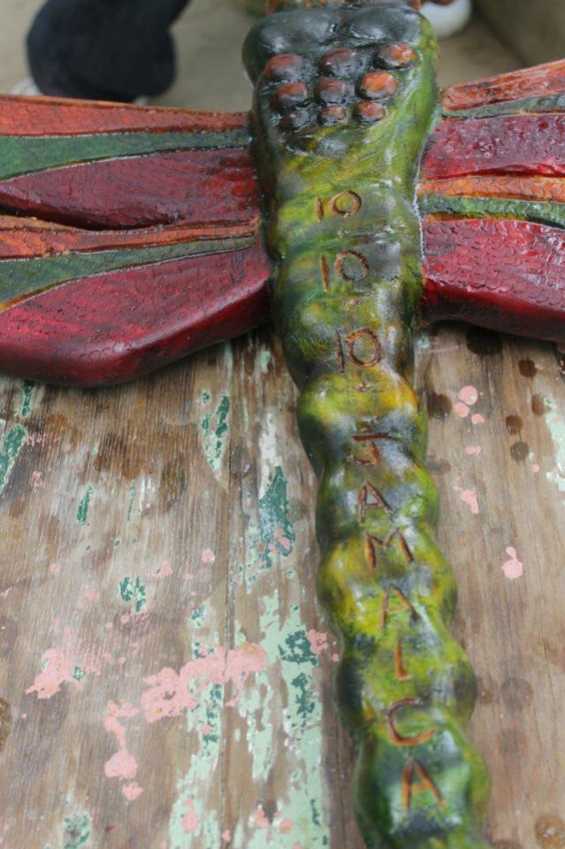 When we went to celebrate our first anniversary we wanted to have someone carve us a Dragonfly as an anniversary gift to ourselves. Dragonflies are my favorite and were the theme of our wedding. Our good friend Chicken recommended his friend, Bobby Ash, who is a well known carver, to do the job. We visited him at his house and explained what we wanted. I told him I wanted a carving of a large Dragonfly with our wedding date and the word Jamaica on it. We gave him a deposit, (always negotiate the cost up front) and told him how long we were in town. We came back the day before we were to leave and he was finishing it up....so it took him 5 days to complete. We were so happy with it