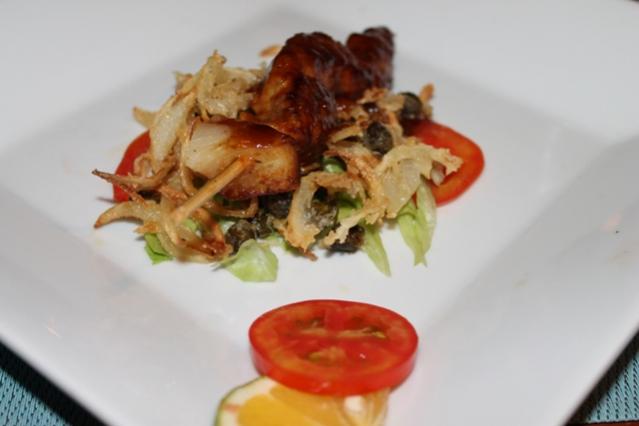 Oh that Bamboo Jerk Chicken Skewer had a bit of grill pineapple on it and under was crispy fried thin bits of onion and CAPERS OY