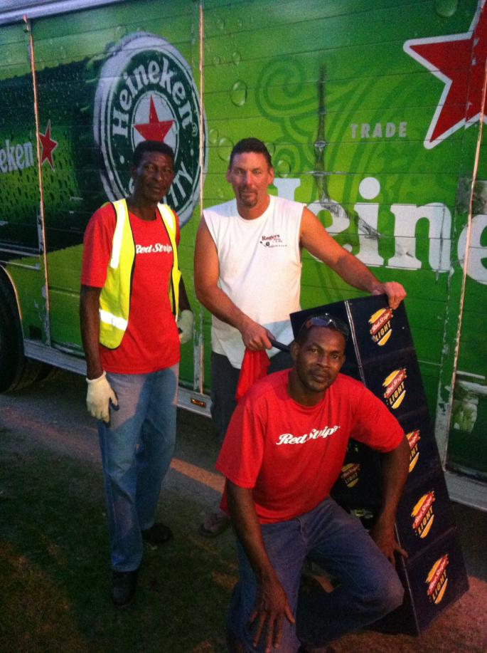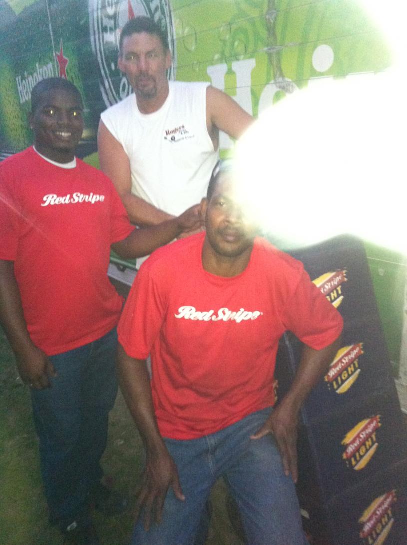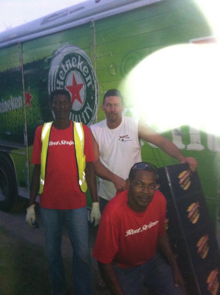 OK, so I was walking on the beach road and these guys were doing there deliveries, I asked if I could help, got a picture, then I asked them "you guys wouldnt happen to have any like t shirts or anything in that truck". They looked and hooked me up with a cool Redstripe shirt right off the truck!