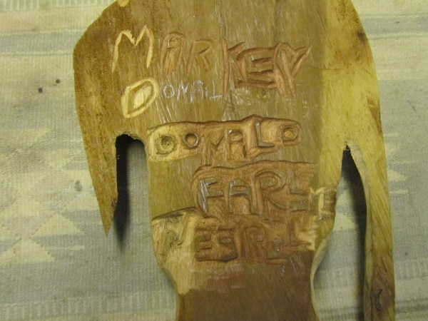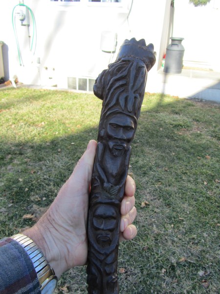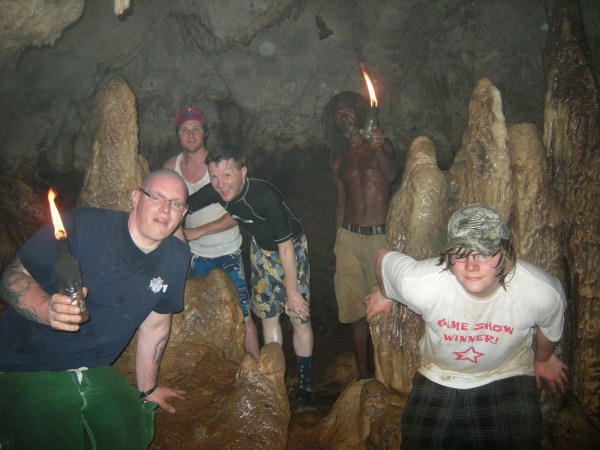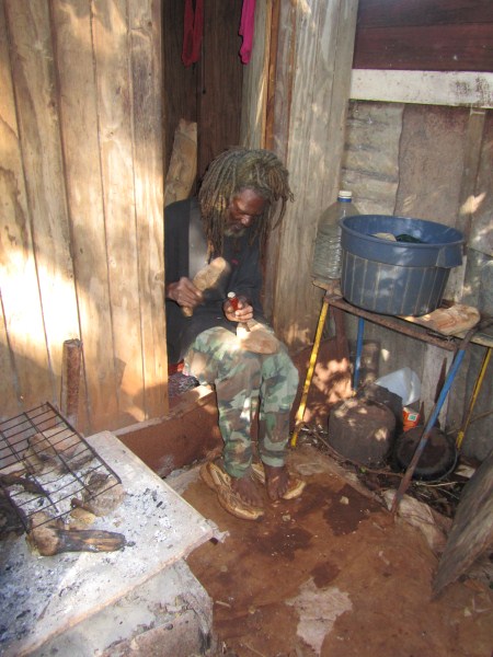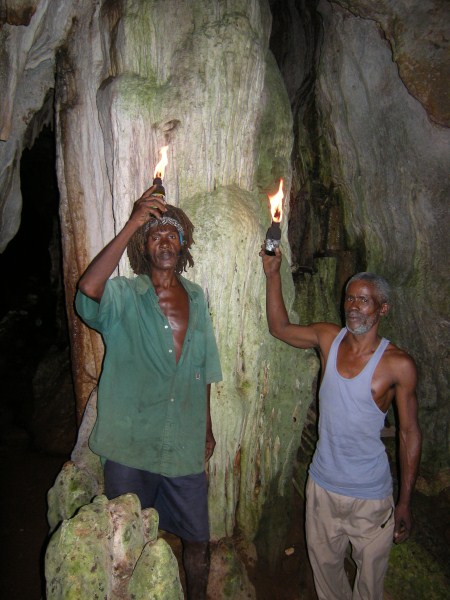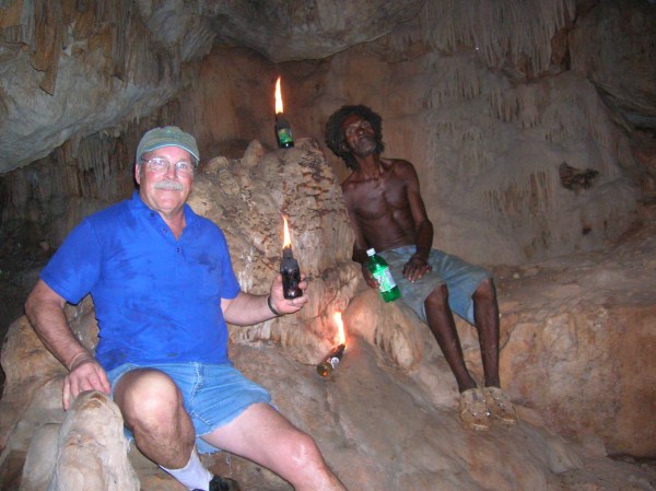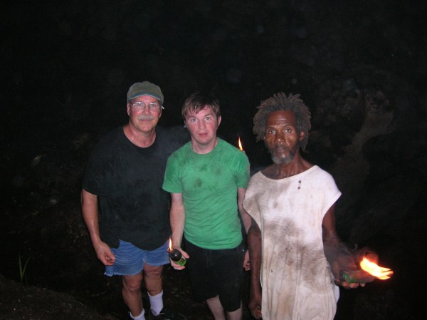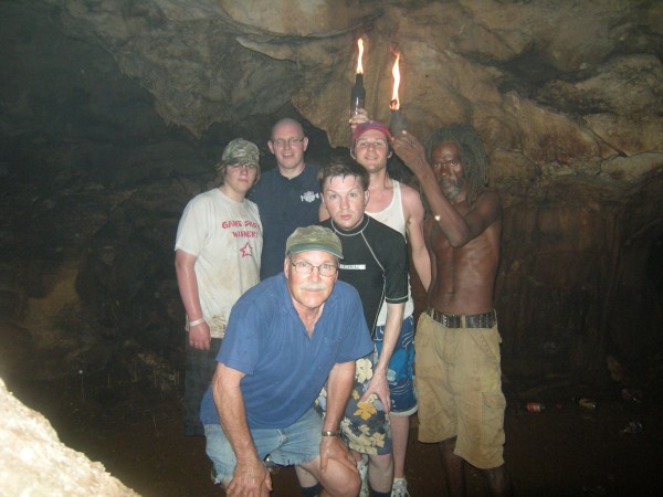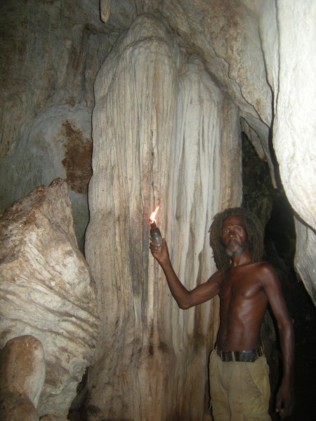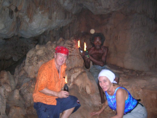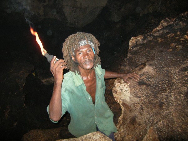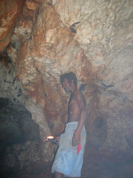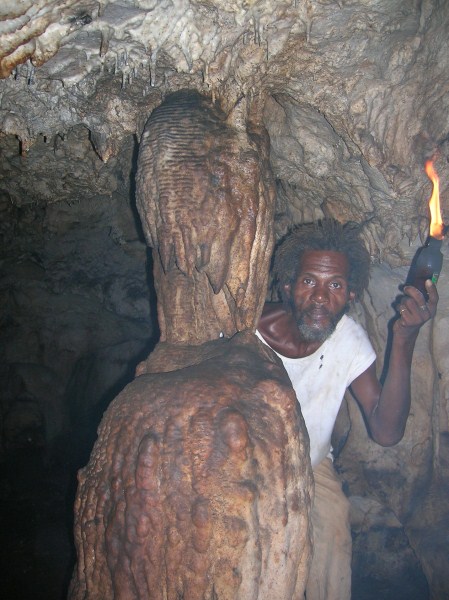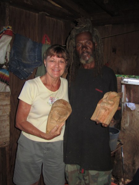I first went to Negril in the early 70's and stayed at a place up in Red Ground called Porter's Cottage. Right in the backyard was an entrance to a neat cave. Local kids would go down to play and once they turned us on to it you couldn't keep us out either. I wrote a story about those early days in Red Ground, but alas, those old stories are no longer in archive on Negril.com. By 1975 Negril was played out and was becoming a tourist attraction. I didn't return until 2007 when I came down with my family to spread the ashes of my cousin who had died, an original hippie who turned me on to traveling. Certainly everything was quite different. I walked up to Red Ground to see if any of the old guard was still around. The area was quite built up compared to more than 30 years earlier and that little entrance to the cave was now in somebody's yard. I inquired if anyone was around that could take me down into the cave. Somebody went to fetch Markie, the cave man. I made arrangement to meet the next day and the 3 of us were handed Indiana Jones type torches to head down. Markie was a slender filthy mess, but he made his living harvesting bat dung to sell to the farmers. After our trip we cleaned up the best we could, paid him his fee and something to drink at Miss Alice's store. He told the story how he had been a kind of caretaker for a Canadian couple who had a small place in Red Ground. He basically looked after the place while they were away (stayed in the house), and they let him stay in a shack while they were there. He had it made. But he met a girl who led him down the path to a hearty coke habit and the Canadians had to evict him. When I met Markie he had realized the mess he was in and had ditched the girlfriend. he was trying to get clean. Wether he was clean at that time or not I really don't know. But 6 months later I visited again and brought along a couple of more people for a cave tour. Markie seemed to be doing quite a bit better. Still skinny as a rail and harvesting the dung, but seemed a bit more together. I stopped into Red Ground next almost 2 years later looking for Markie. Miss Alice showed me where he lived and i got a good look at his house. On the last visit he told me he used to carve wood, but had no tools, so I had brought him down a fairly cheap Harbor Frieght wood carving set. He was thrilled. He was doing quite well and by this time had comletley kicked any drug habit for sure. He had a little garden at his house. The next visit was November 2010 to plan our daughters wedding. I took my wife up to meet Markie and he took us on a couple mile walk deep into Red Ground. We stopped at Fuzzy's house and rested a while. We also walked up to what he called "Skull Gate" another friend who had a place with a fantastic view ofall of Negril beach from up in the hill. This time we had brought him some clothes that would fit someone 5' 10" and weighing 120 lbs!. We also brouhgt him a nice pair of slightly used sized 11 sneekers. Our daughter got married in May 2011 and the morning of the wedding 5 of us (including the groom) went up for a cave tour. The guys loved it. By this time Markie was doing really well. Still loving hand to mouth, but really intigrated into his neighborhood. He gave me a carving and some of the others spent money for other carvings. Living up in Red Ground he has very little contact with tourists and has sold very few of his carvings. he was really happy for the extra money from the tour and the sale. December 2012 we stopped down again. He had gotten word to me that he had a very expensive lignum vitae walking stick he had been working on for long time. It was out of this world expensive but when I saw it I knew I had to buy it. We had brought him a couple of pairs of slightly used running sneekers this trip. He gave us a sanll carving for my daughter for a wedding present. and had made a carving just for me. It is a nice carving, but what made it special was that he carved his entire name on the back, even misspelling his last name! The walking stick is all anyone talks about, but his signed carving is what made the day for me. He told me I was the best American friend that he has. We had originally took him as as kind of a project, and it has been nice to see him do better. I never expect anything from him and give to him out of the love of my heart, and he has done so to me.