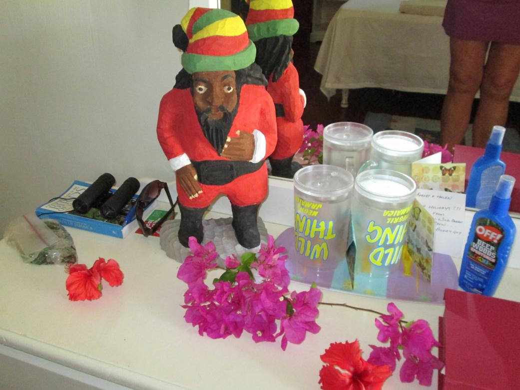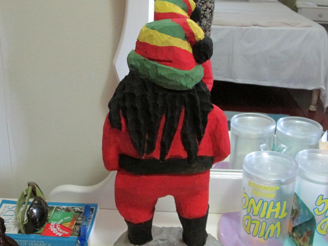 When we reached in October, 2012, Mi Lady asked Donavan, the carver at the CocoLaPalm if he could make her a Santa (she collects Santas). He said that he had not made one but would "try" to make one for her. We gave him a thousand J note "to buy the wood".