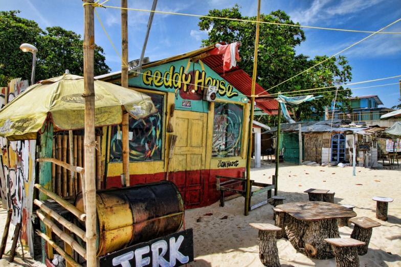 We passed through 7-Mile Beach and arrived at the Spa just at the North End of the Cliffs. It was an impressive resort designed by the owner, who is also an architect. The thatched roof huts had a symmetrical design from the inside and the polished wood ceiling and floors gave it a rustic look. We dropped our bags and had and had the front desk call us a cab. We watched the sunset from our balcony and then made a b-line straight for the beach. The cab driver took us to Bourbon Beach where we had some drinks and a couple of appetizers. A guy walked in and sat at the bar a few seats away from us and I commented on his cool Neil Young t-shirt that he was wearing. We struck up a conversation and he said he’d originally come to Negril for just a few days, but ended up staying and canceling the rest of his destinations in the Caribbean. He said he’d found an apartment for 500 dollars a month. I thought that was a pretty cool thing to hear, considering we’d only been there for a couple of hours.