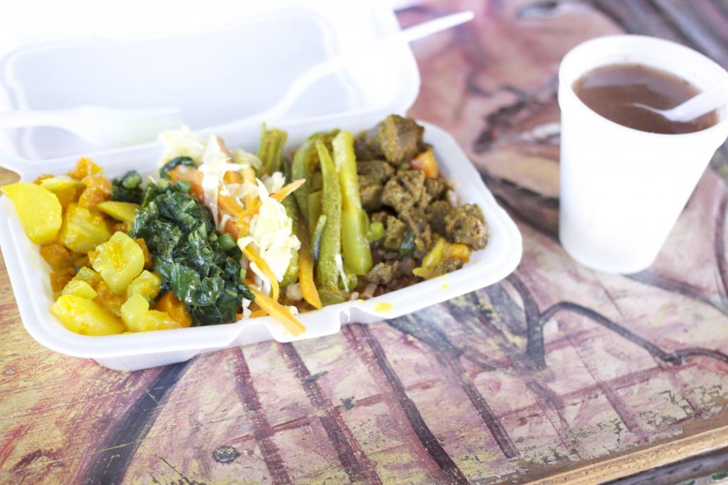 After the juice it was back to Ras Rody for an absolutely fantastic lunch! Rice & peas, curried pumpkin stew, callaloo, cabbage, curried okra, veggie chunks, and a pumpkin soup too!