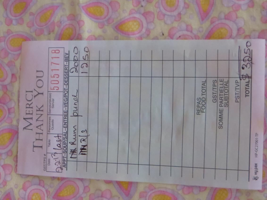 Most of our afternoon Happy Hours occur at the Canoe and tonight was no exception. I am a lover of the Rum punch and you can’t beat the price ($400J for 2). There were four of us and Melo as usual drank Red Stripe and the other three of us drank rum punch. Here is a picture of the bill, keep in mind that each tick mark next to the Rum Punch actually means 2 punches. Our driver helped Melo out on the Red Stripes, she can drink, but not normally 5 in an hour!!!! Also some pictures of the sunset from Canoe, you don’t get the sun from there, but I really like the different colors in the water and in the sky that you get from there.
