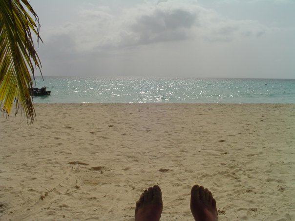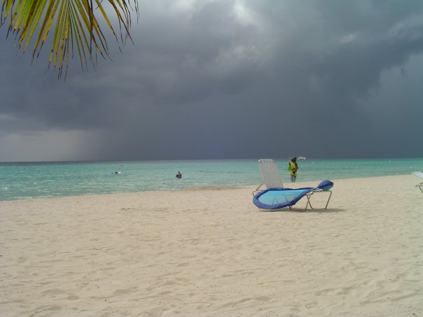 Our last full day here. We got up again at 6 AM. We both went straight out to the beach with our coffee, trying to soak up as much as we can. We came in and had some breakfast. We were trying to eat our leftovers from the grocery trip so we had muffins and spice bread. We got on our swimsuits and headed back to the beach. Into the sea to cool off and back to her chairs, back and forth like this for a lot of the day. When the fishermen came in we bought some fish from him to fix for lunch. We put it in the fridge and headed back to the beach for a little longer. It started to rain so we thought it would be a good time to come in and cook the lobster. Again, we had to go in the office to use the stove there to boil the water. It started to rain hard, then harder! We ended up having a pretty good storm and losing power. We ate the lobster on the porch, then took a quick walk down the beach since I was out of Pepsi. We went to the bar at Sun beach and their power was out as well. no worries though, our power was back on by the time we got back to our room.